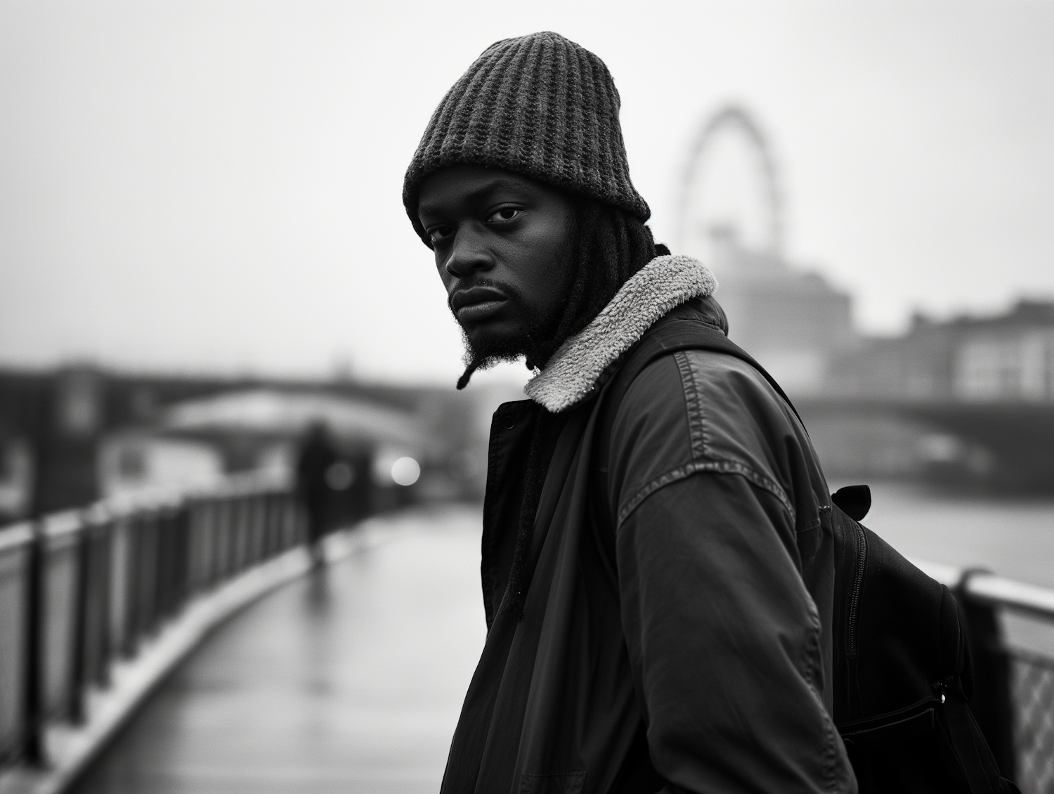 Black and white portrait of a man on a bridge, wearing a beanie and jacket, with a cityscape and Ferris wheel in the background.