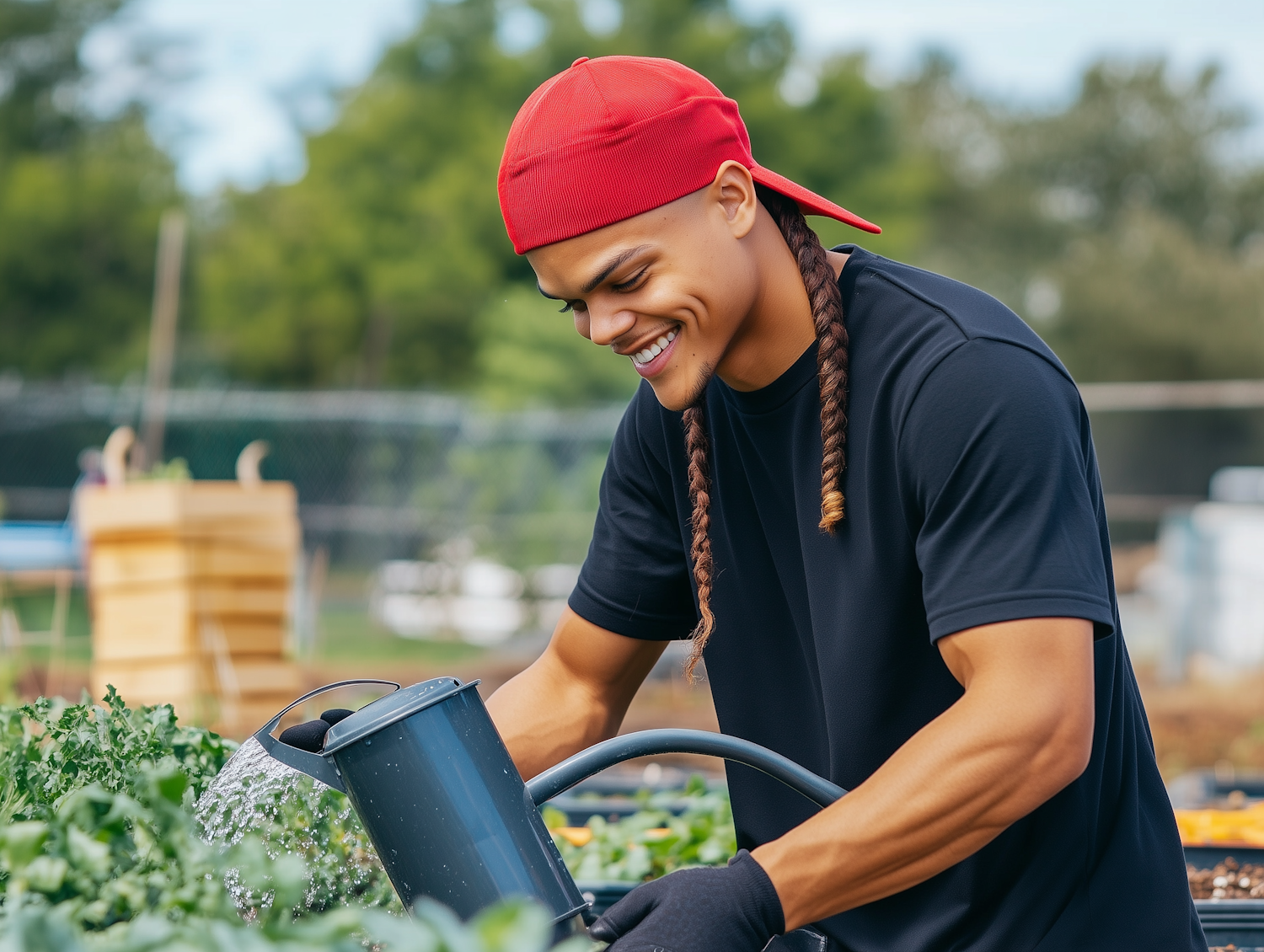 Young man with braids and red cap waters garden plants with a blue can, wearing black t-shirt and gloves, smiling outdoors.