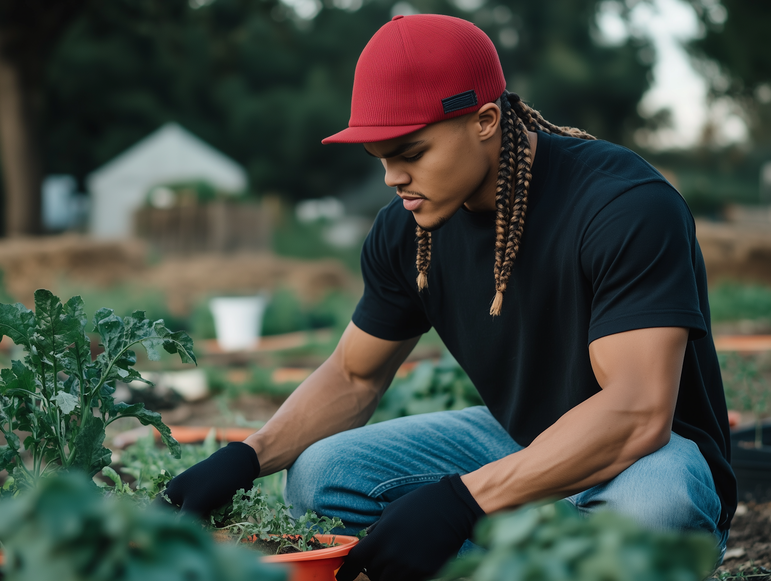 Young man with braids gardening, wearing a red cap and black gloves, focused on tending plants in a lush garden.