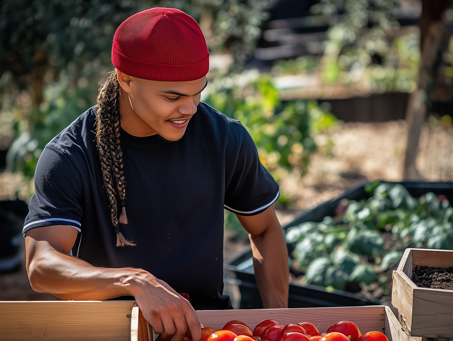 Young man in a garden picking ripe tomatoes, wearing a red beanie and black t-shirt, surrounded by lush greenery.