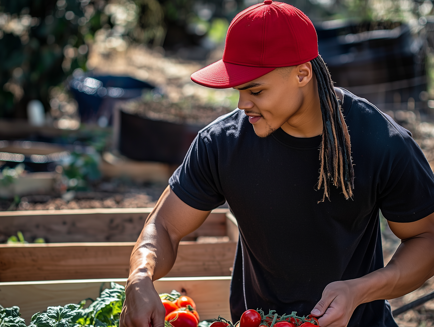 Young man in a red cap picking tomatoes in a garden, wearing a black t-shirt. Sunlit scene with a focus on fresh produce.