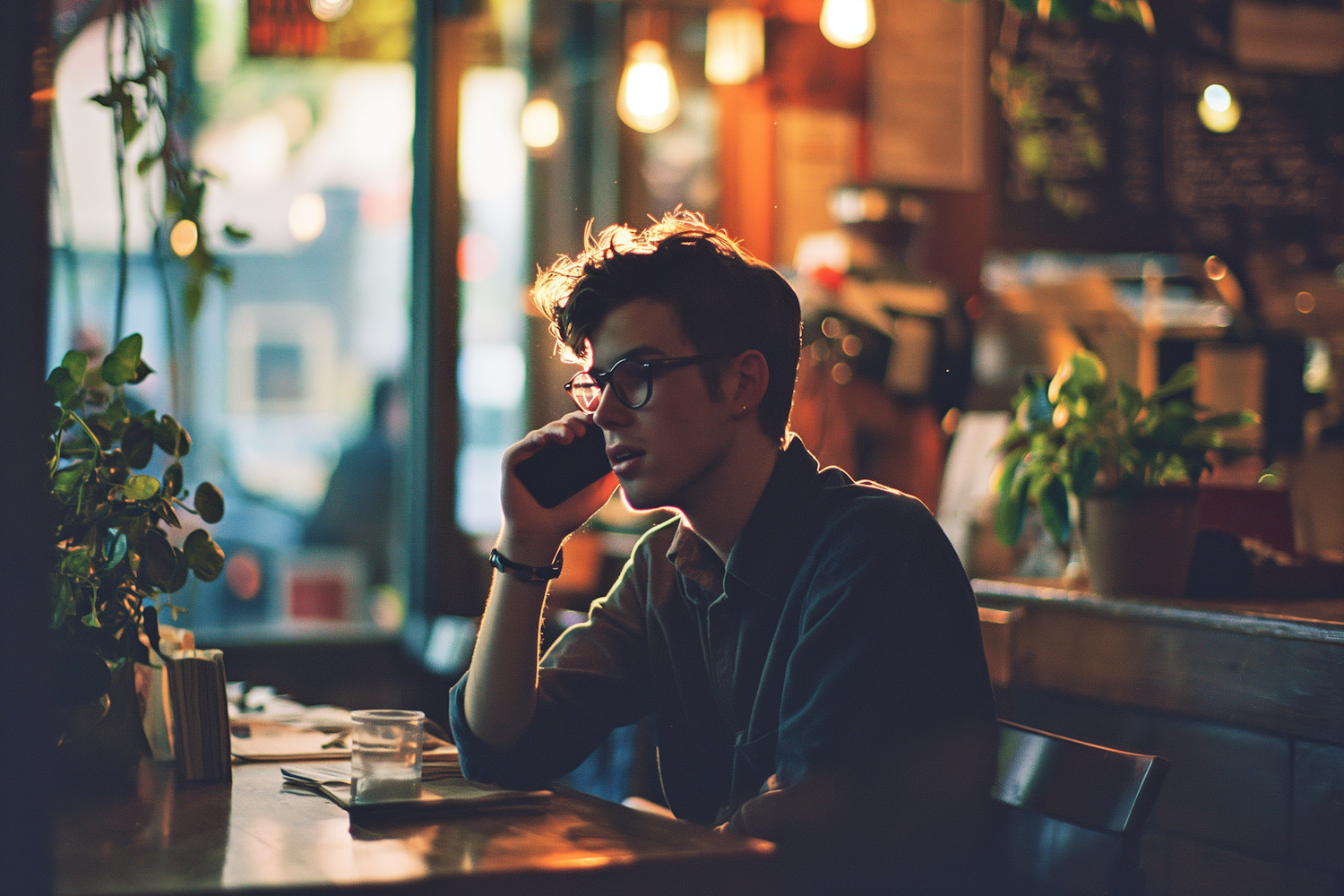 Young man with glasses in a cozy cafe, talking on the phone. Warm lighting and plants create a relaxed atmosphere.