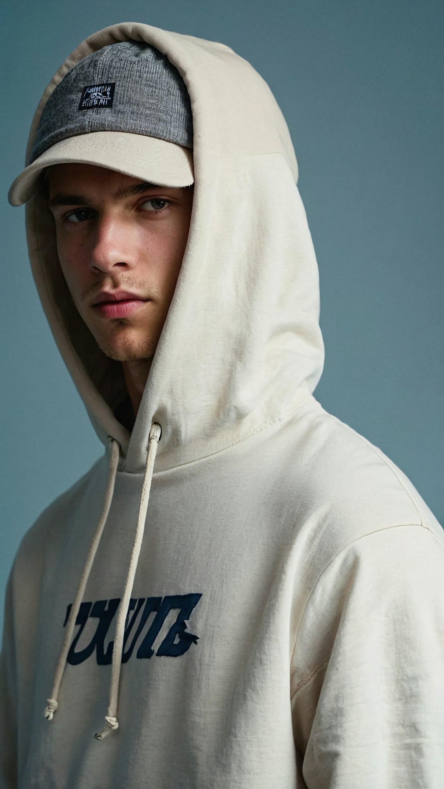 Young man in beige hoodie and gray cap with neutral expression against a blue background.