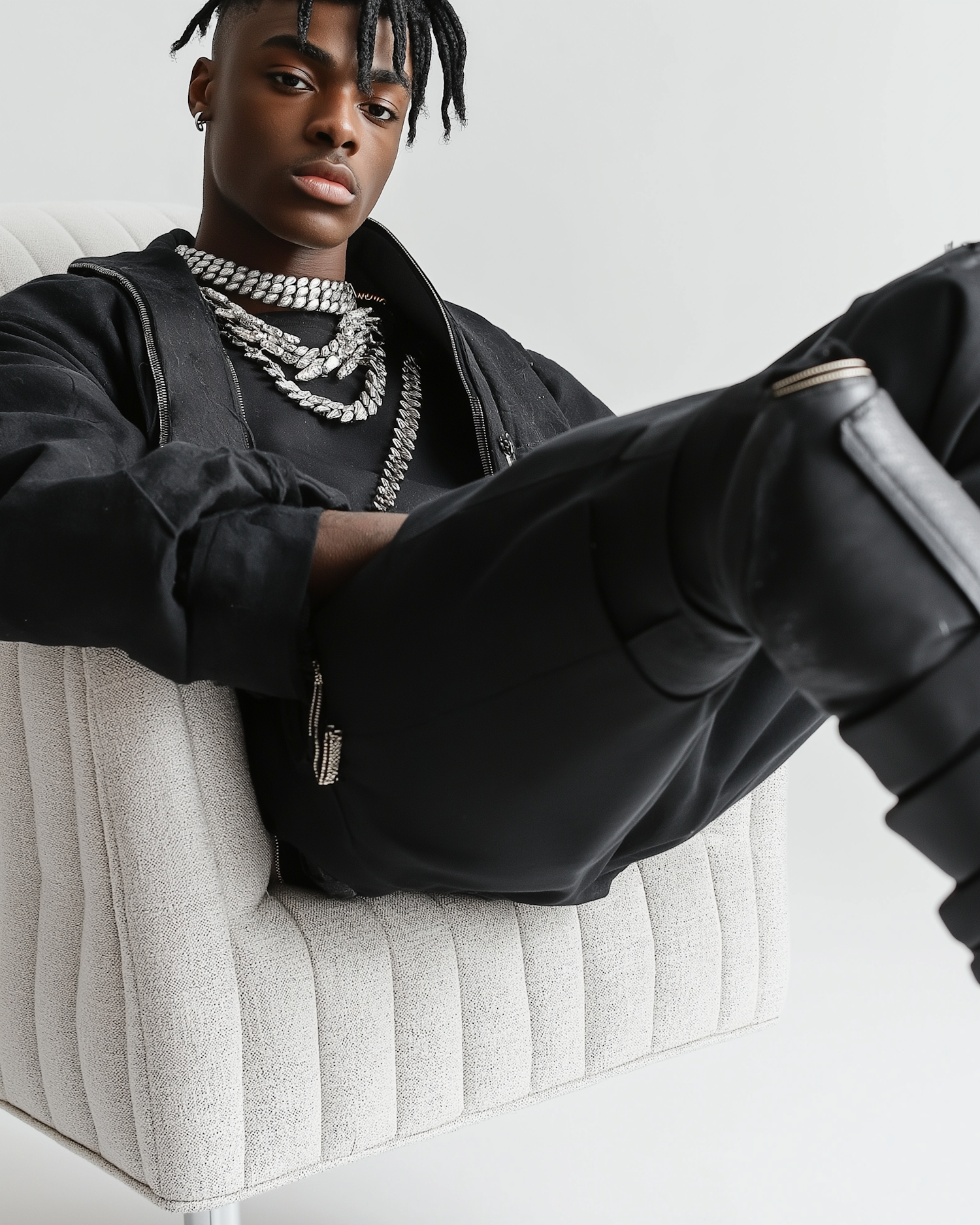 Young man with dreadlocks and silver chains sits confidently in a modern armchair, exuding style and elegance.