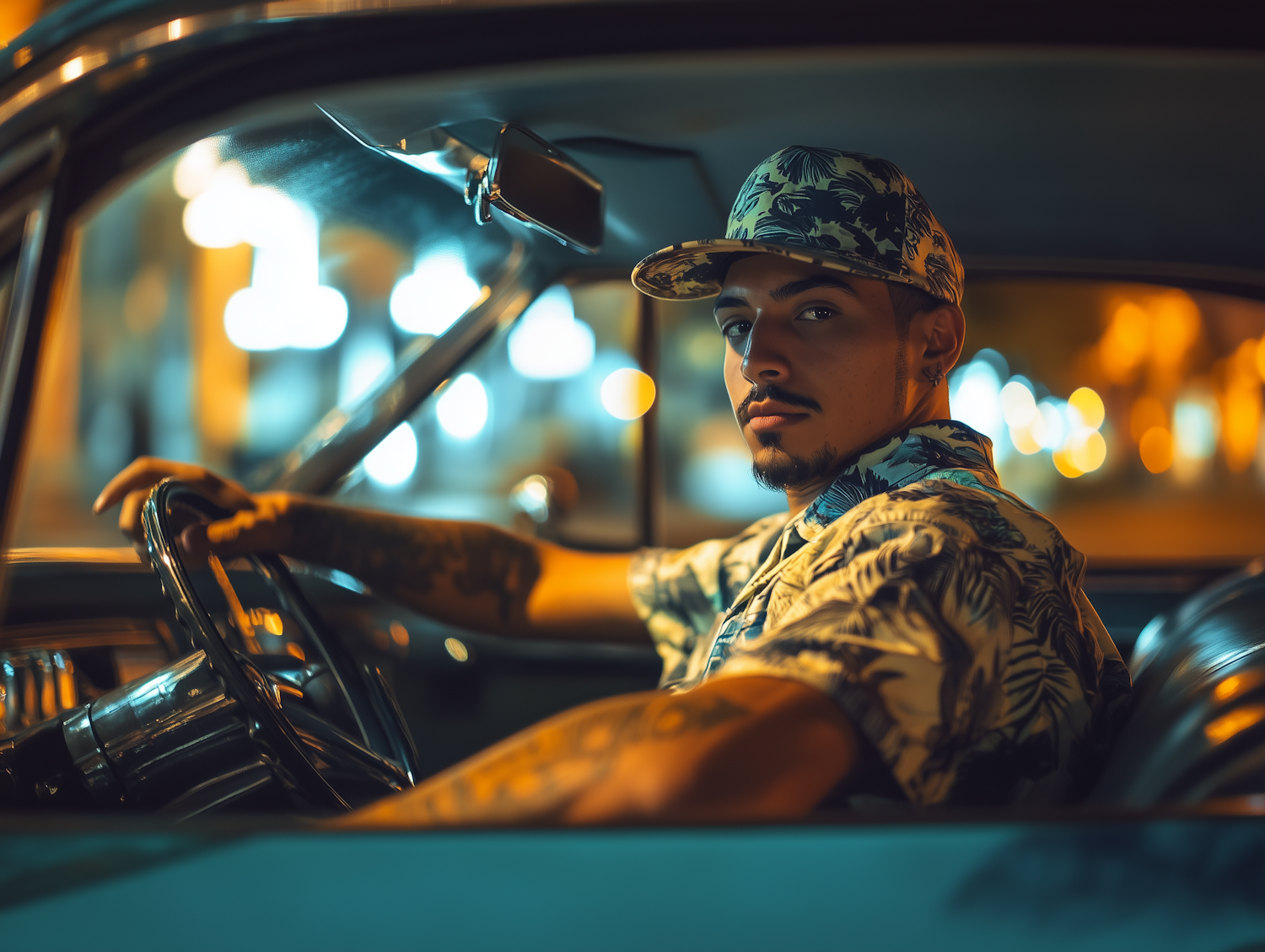 Young man in a vintage car at night, wearing a tropical cap and shirt, with city lights creating a warm bokeh effect.