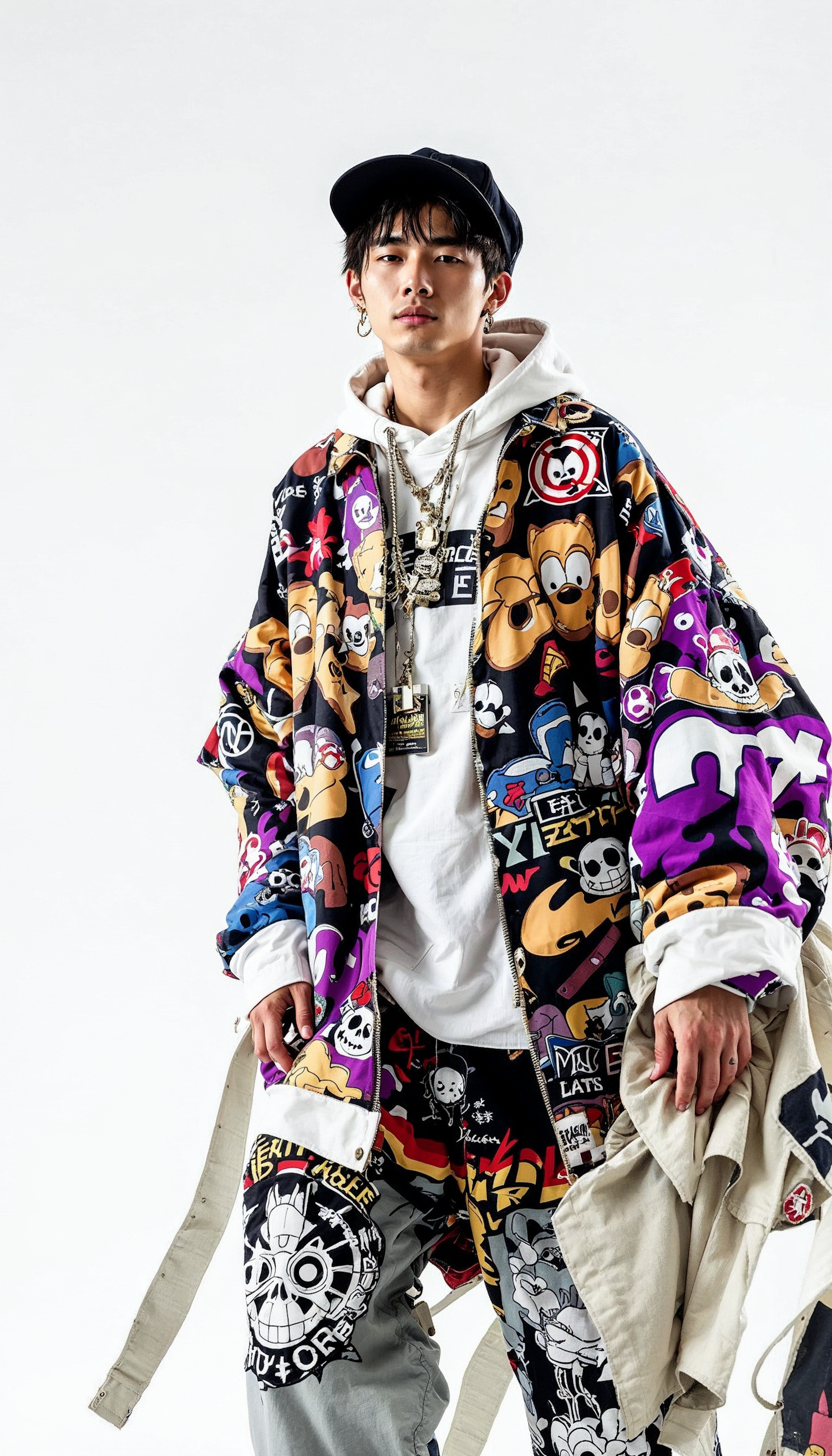 Asian male in vibrant cartoon-themed streetwear with a black cap and gold chains, exuding trendy urban style.
