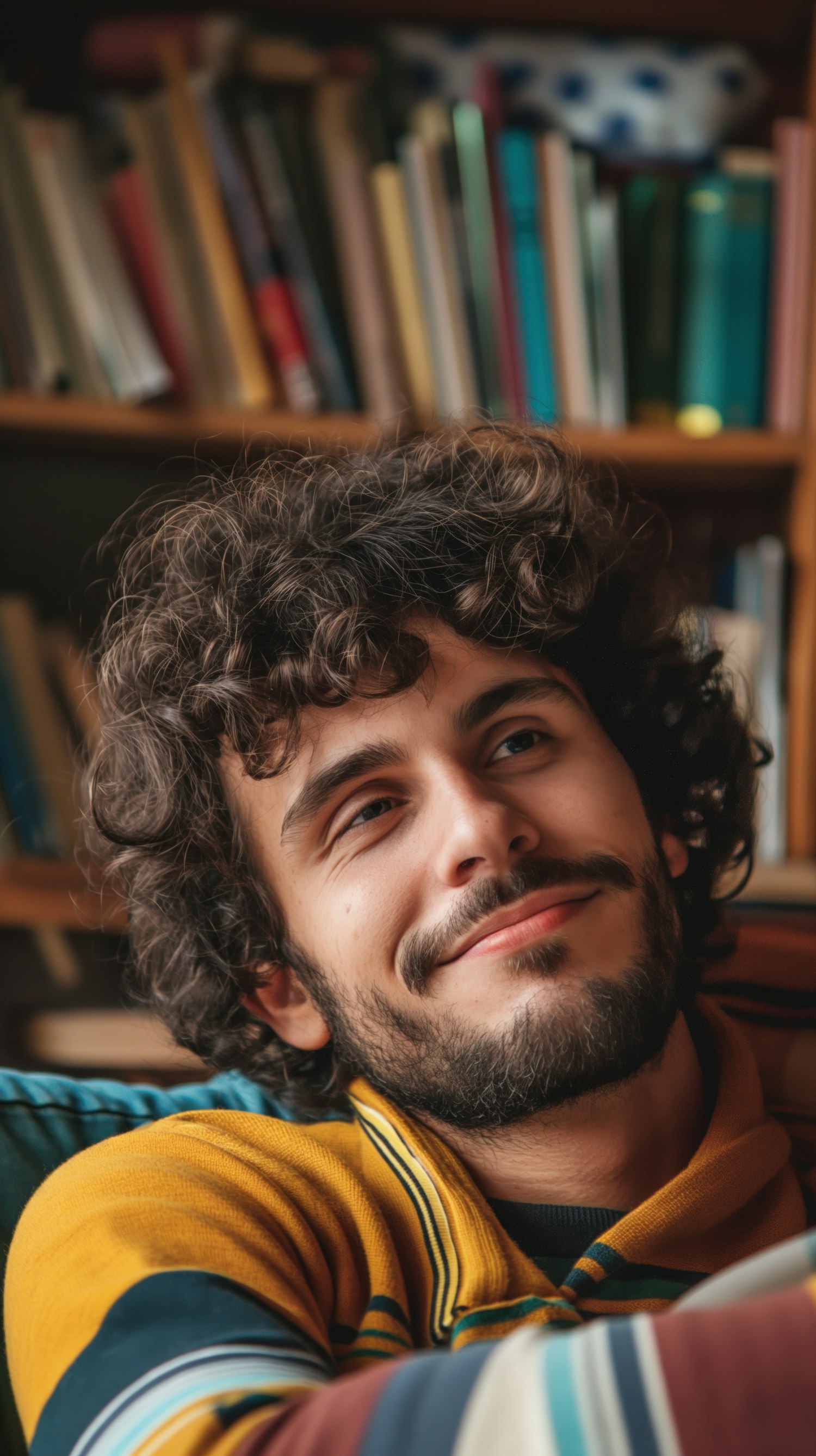 Young man with curly hair and beard, smiling in a cozy setting with a bookshelf in the background.
