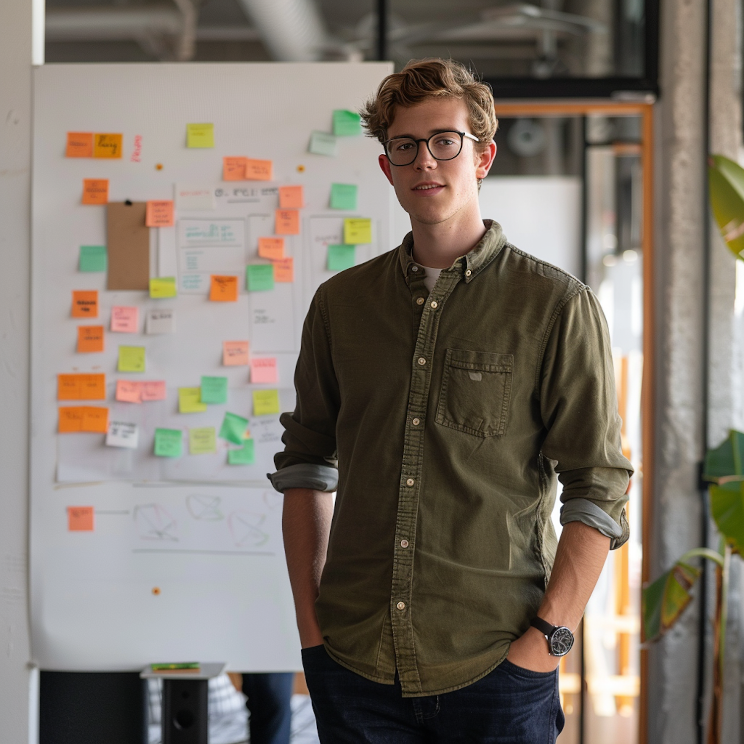 Young man in casual attire stands in front of a whiteboard with colorful sticky notes in a modern office setting.