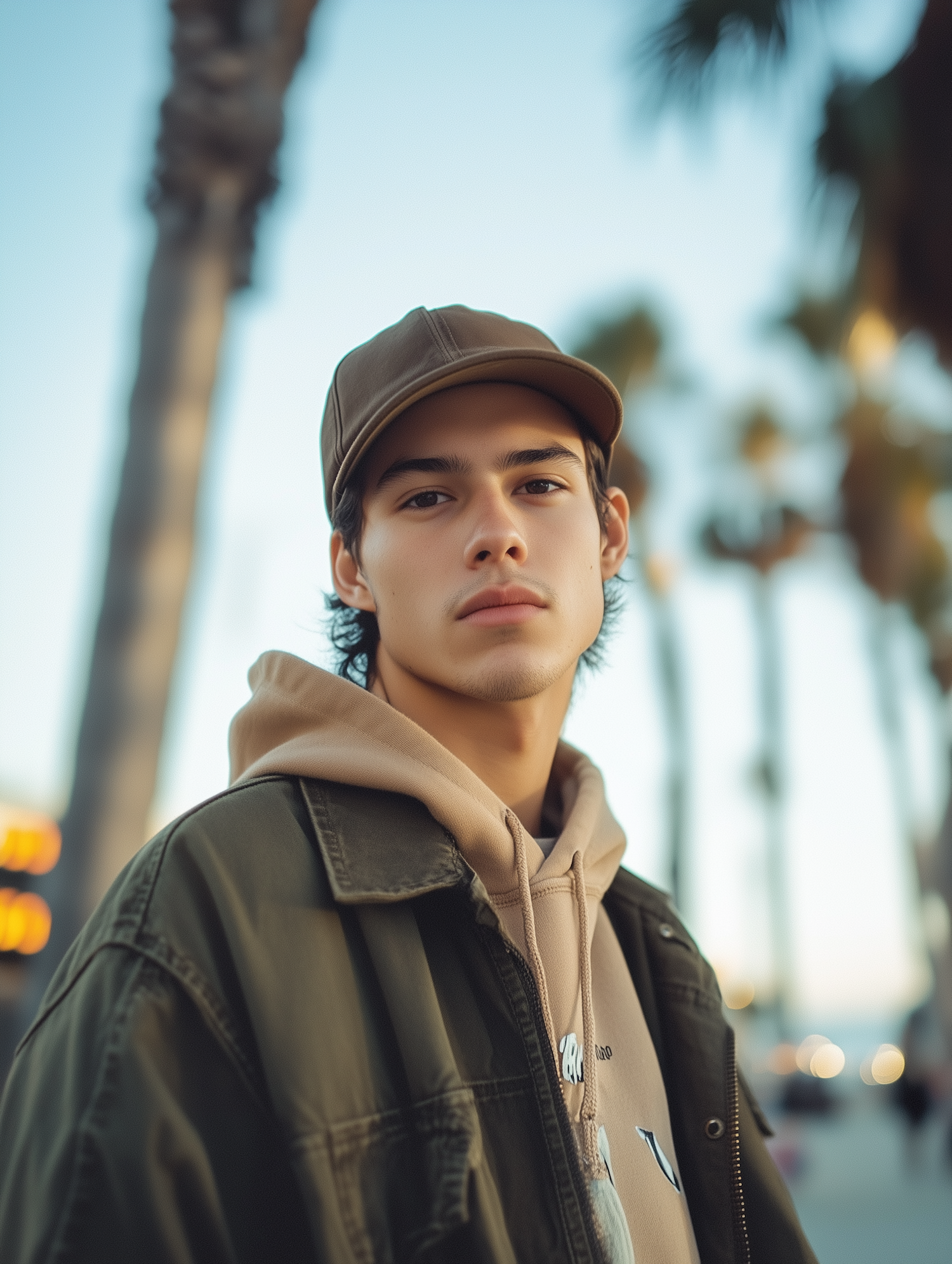 Young Asian male in a brown cap and green jacket, standing outdoors with palm trees in the background, soft lighting.