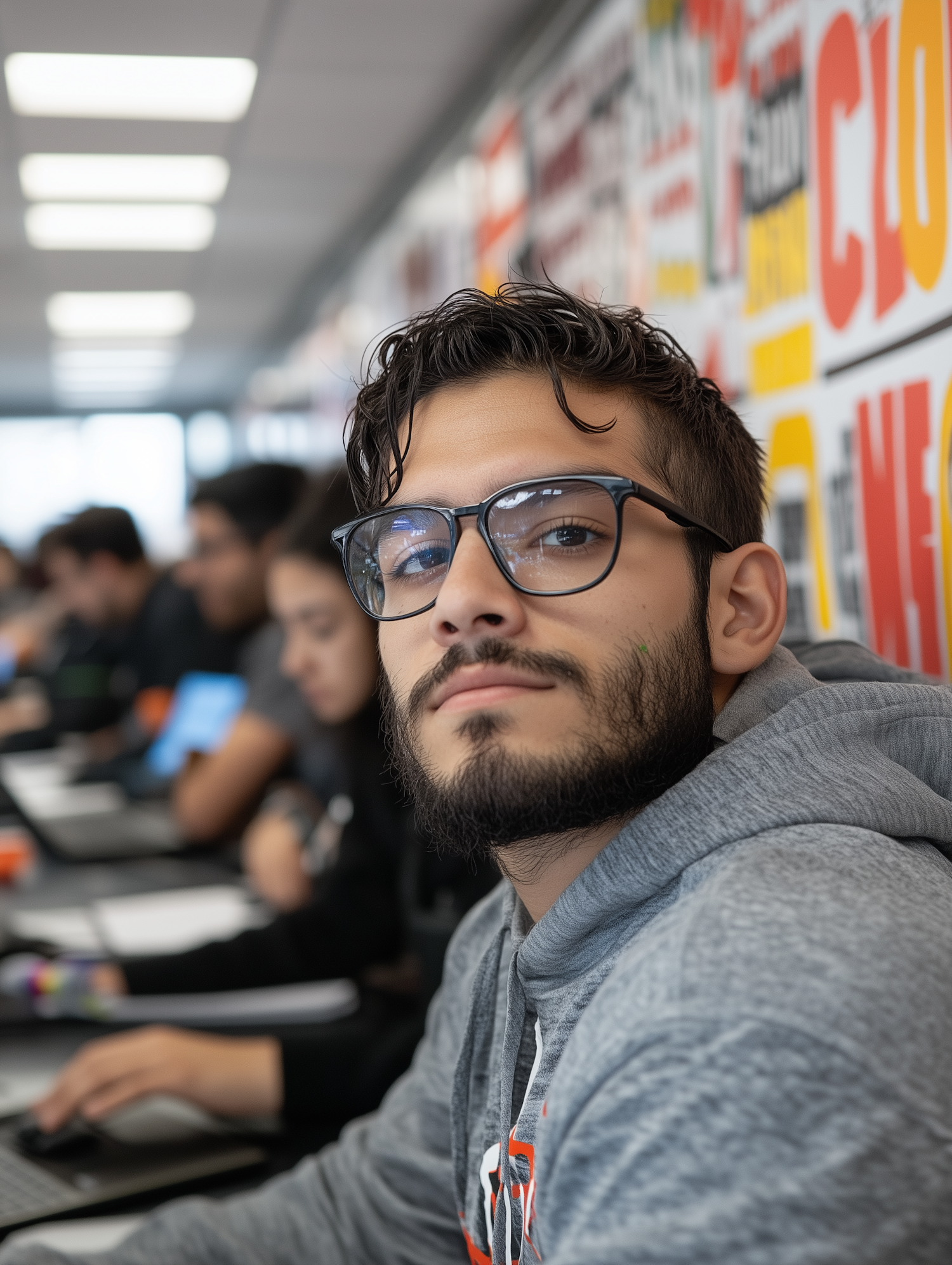 Young man with glasses and beard in a classroom, wearing a gray hoodie. Background shows students and colorful posters.