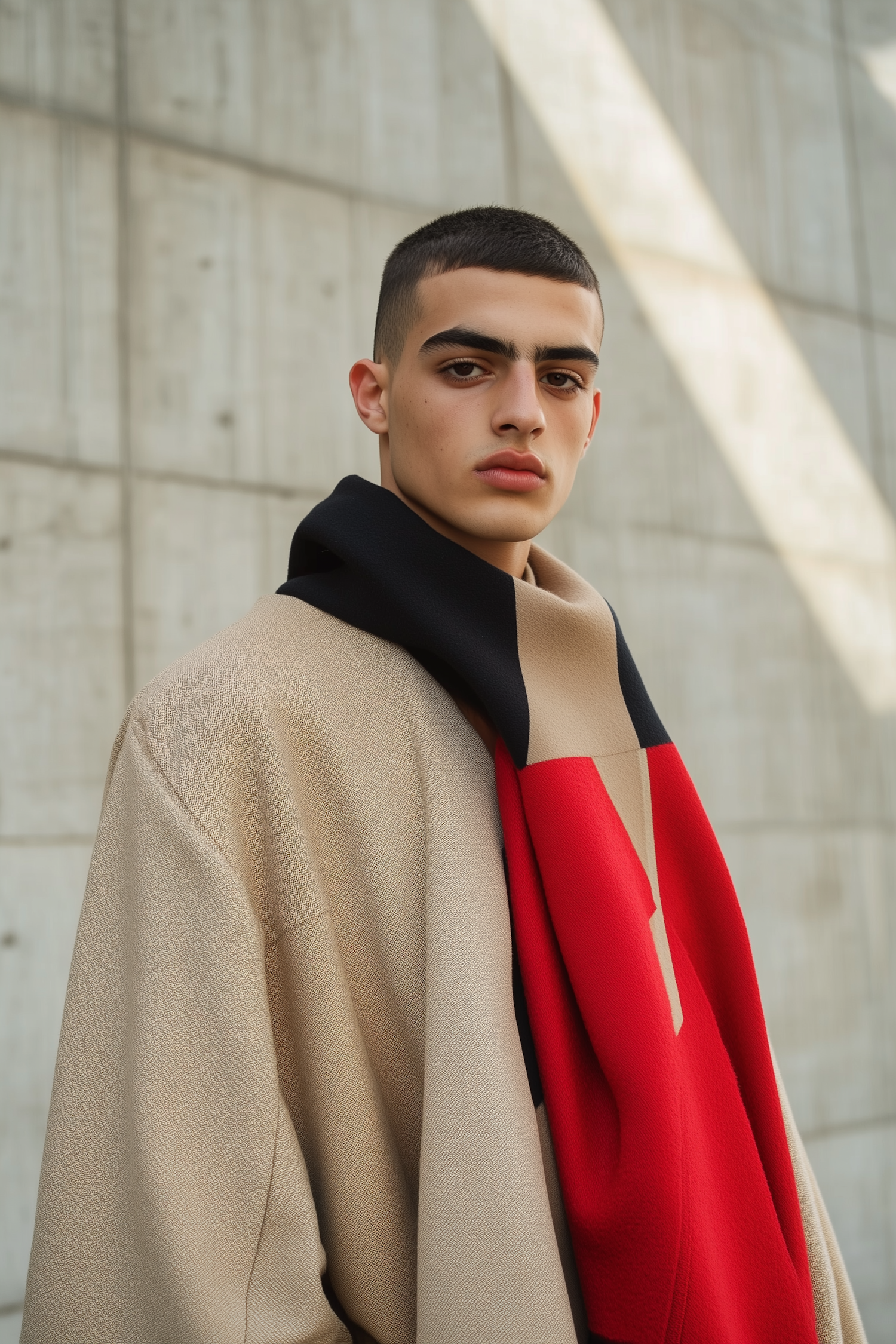 Young man in a beige coat with a red and black scarf, standing against a concrete wall, exuding modern style and confidence.
