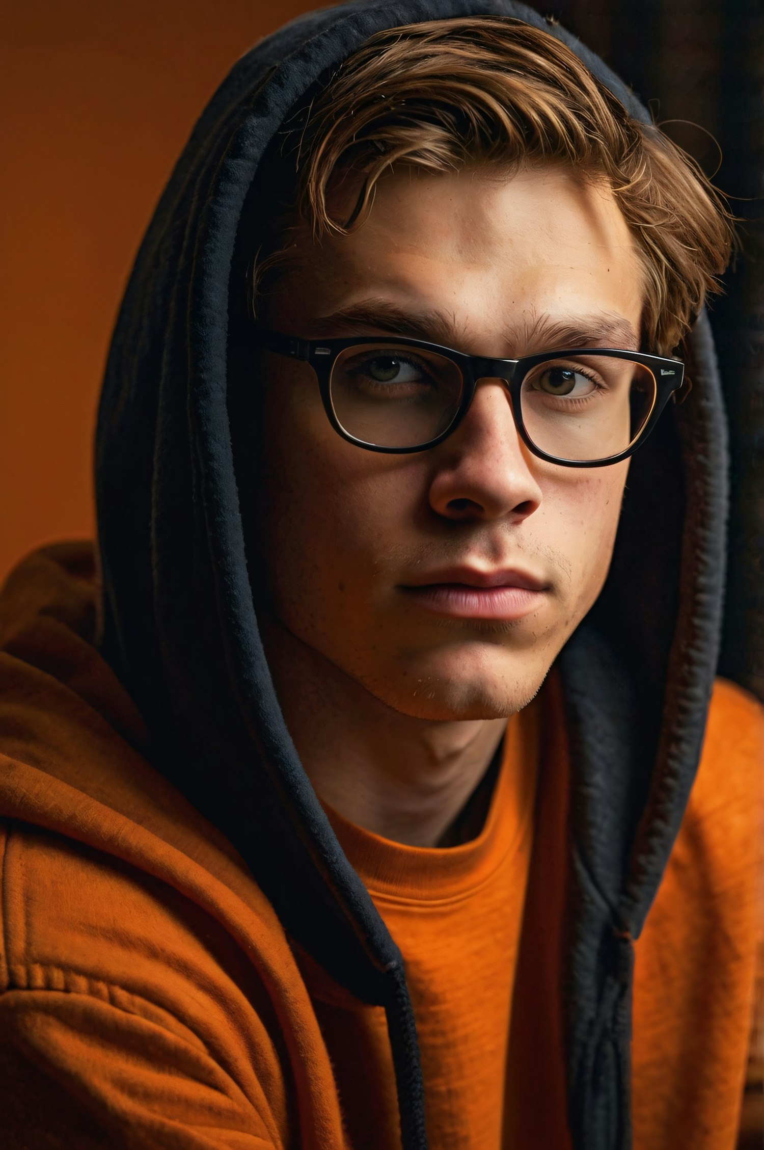 Young man in orange hoodie with glasses, light brown hair, and stubble, set against a warm orange background.
