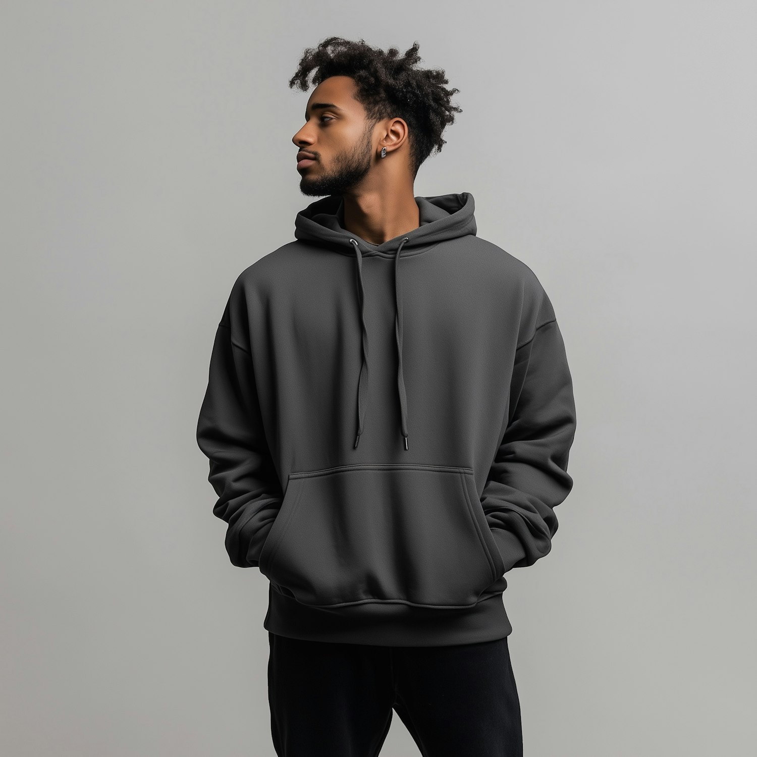 Stylish young man in a dark gray hoodie with textured hair and hoop earrings, standing against a plain gray background.