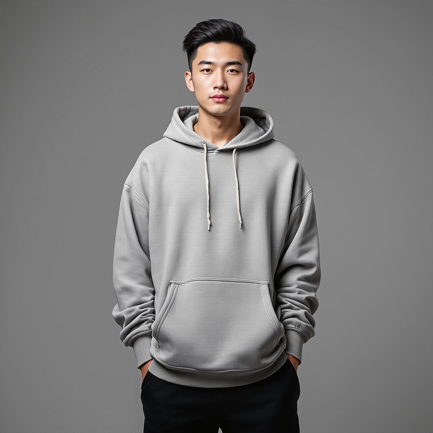 A young man in a light gray hoodie stands against a neutral background, showcasing a casual and modern style.
