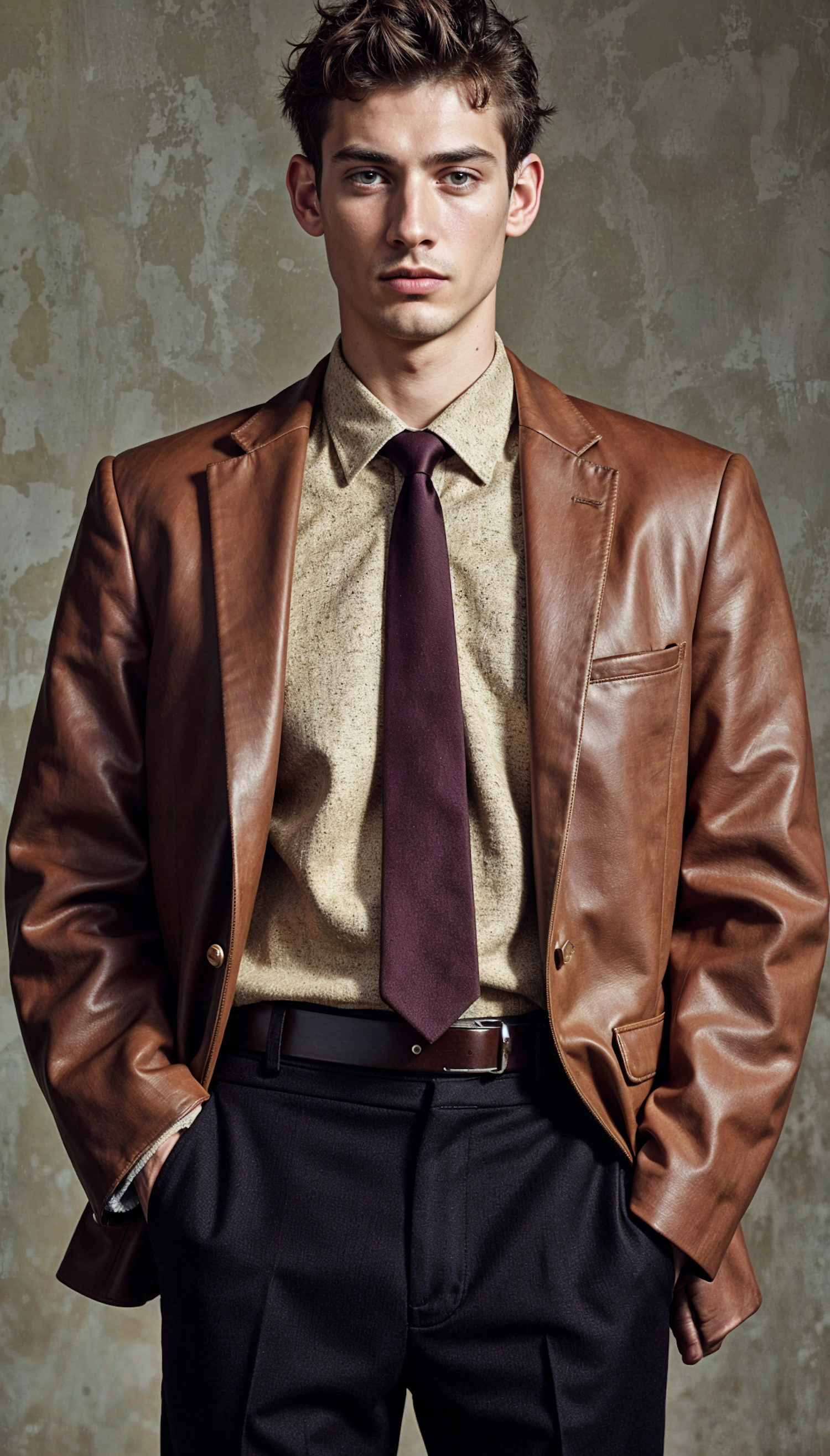 Stylish young man in a brown leather jacket, beige shirt, and maroon tie against a textured wall.