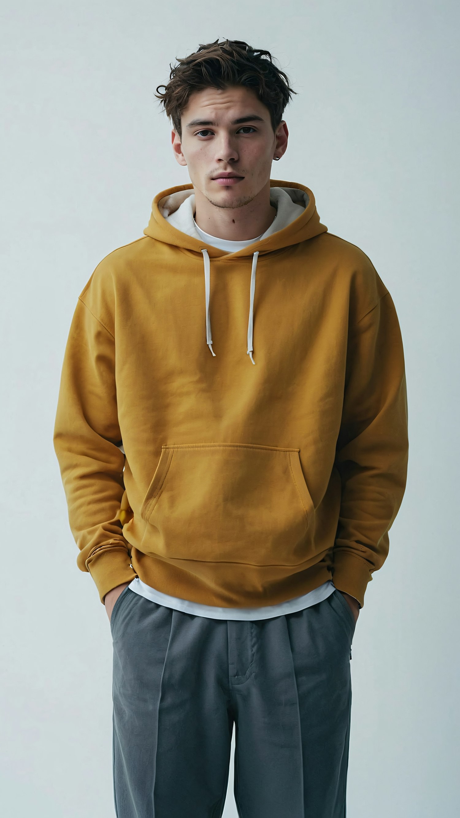 Young man in mustard hoodie and gray trousers, hands in pockets, casual style, blurred face, tousled dark brown hair.