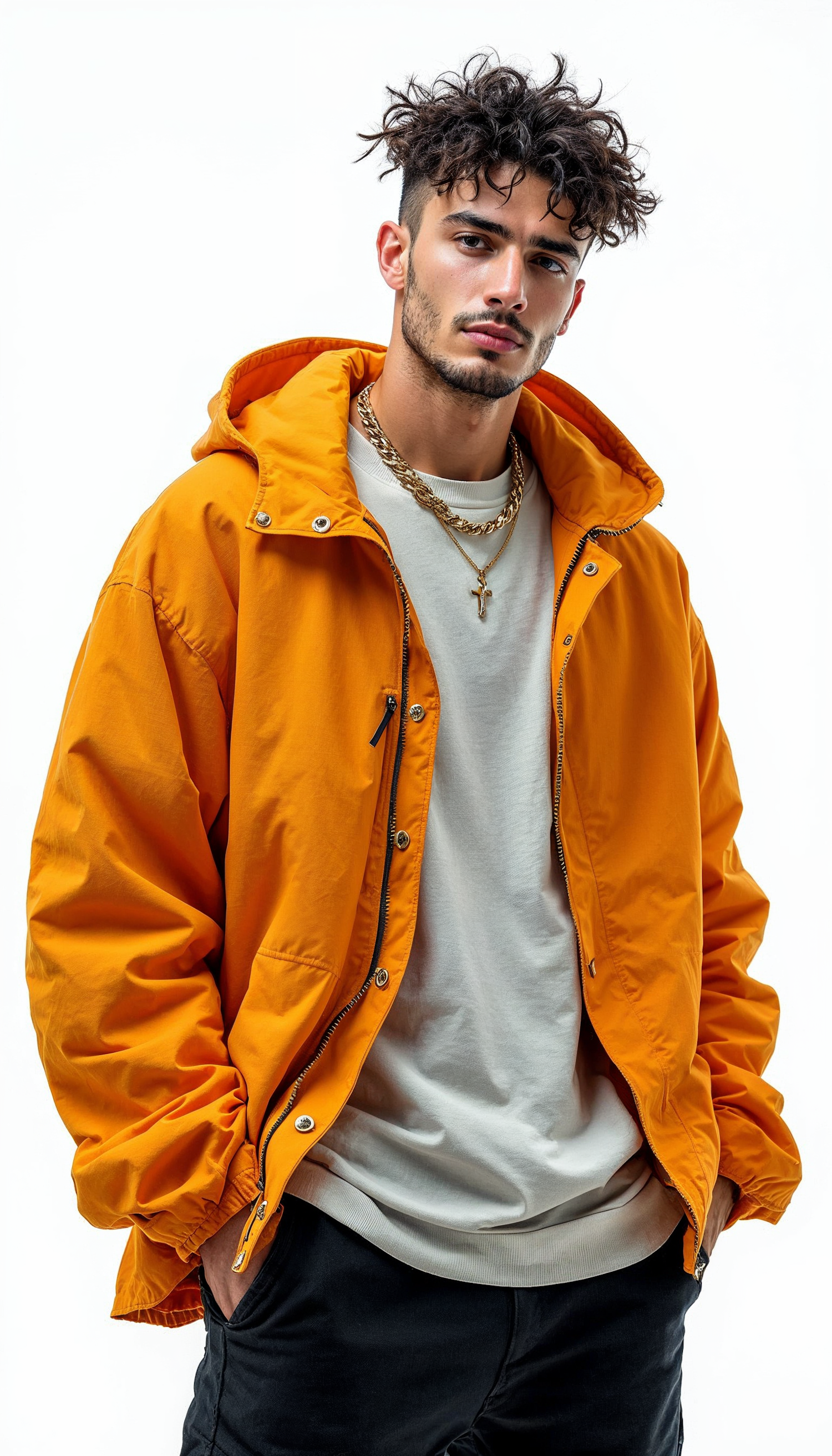 Stylish young man in an orange jacket with gold chains, curly hair, and a confident pose against a white background.