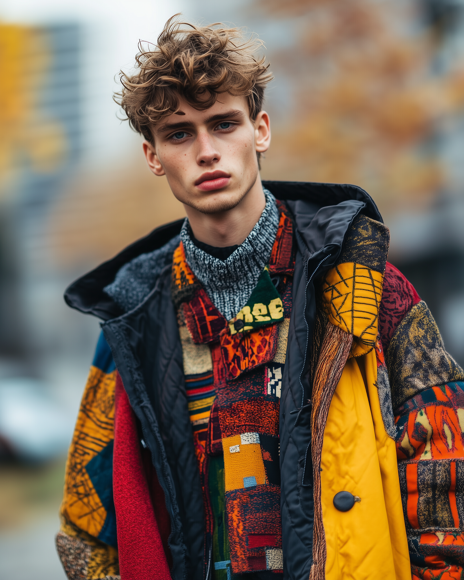 Young man with curly hair in a colorful patchwork jacket, standing outdoors with a serious expression. Urban autumn background.