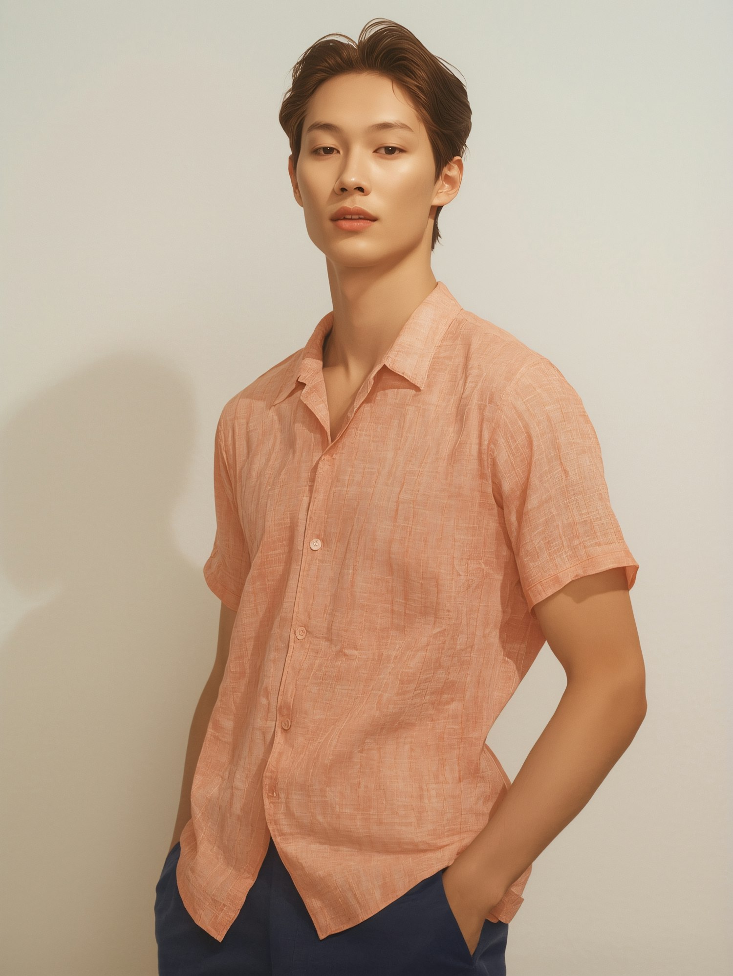 Stylish young man in a peach shirt and blue pants, posing confidently against a light background. Perfect for fashion inspiration.