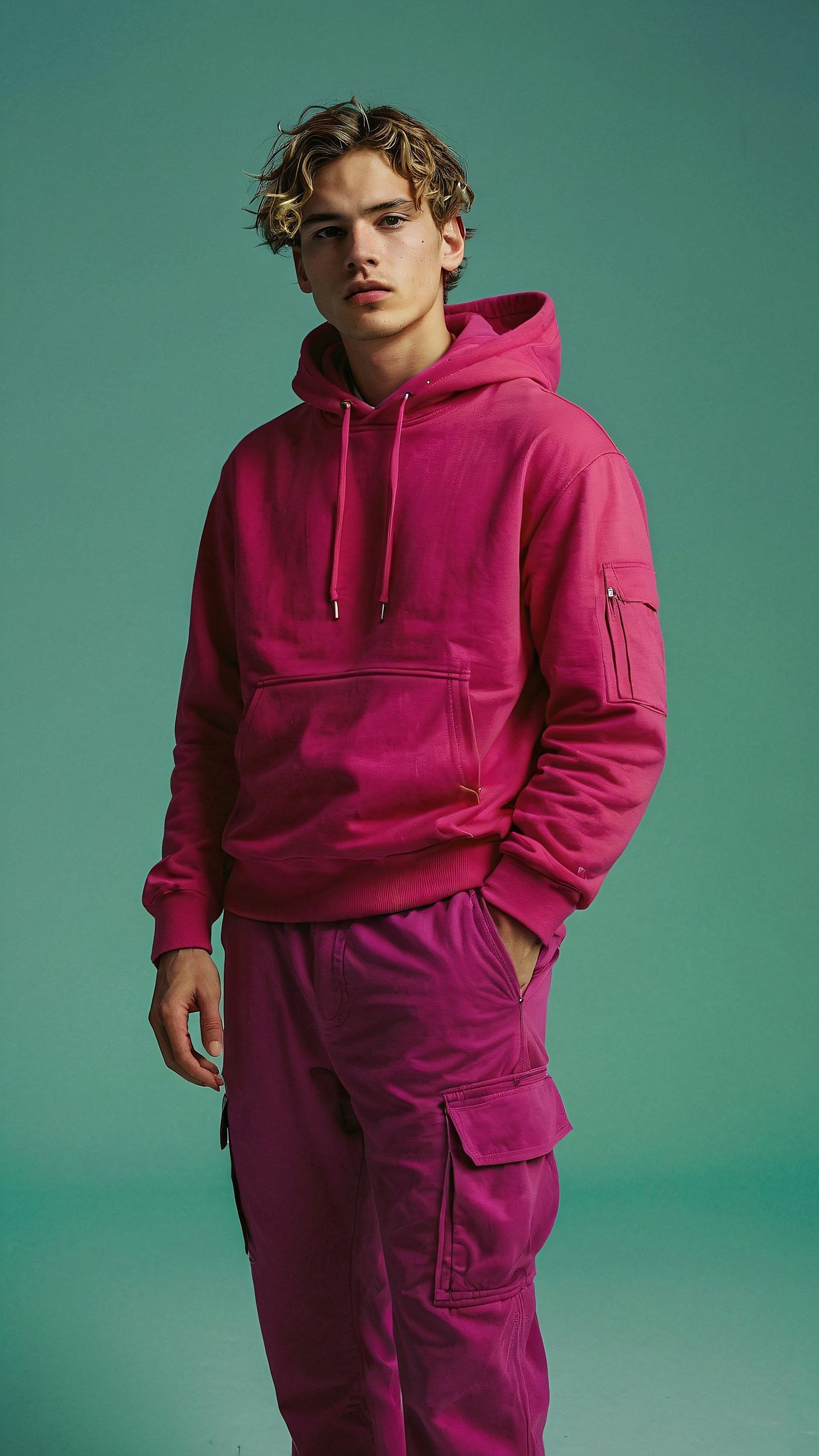Young man in vibrant pink hoodie and cargo pants against a teal background, exuding a confident and stylish vibe.