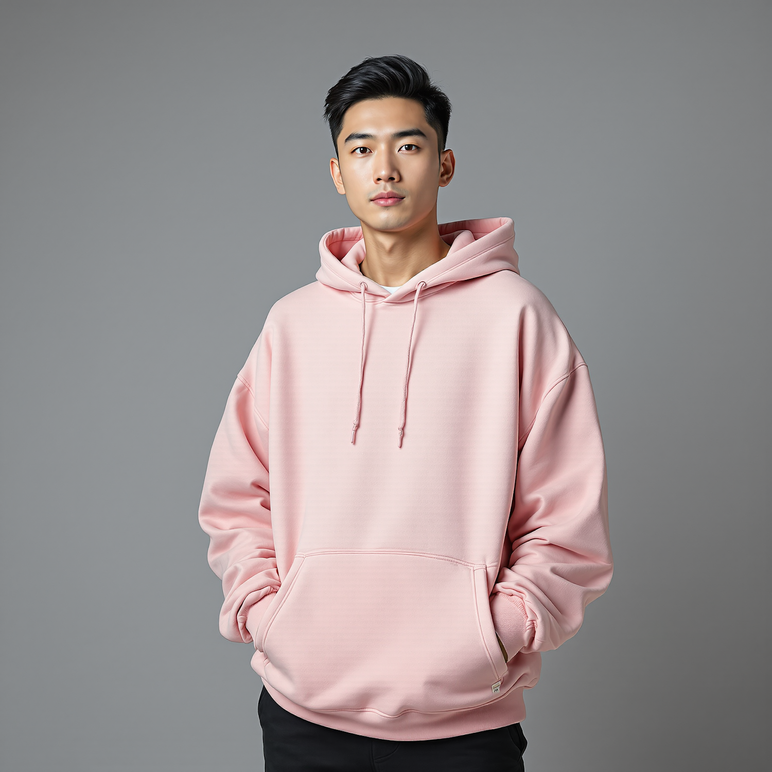 A young man in a light pink hoodie and black pants stands against a gray background, exuding a casual and modern style.