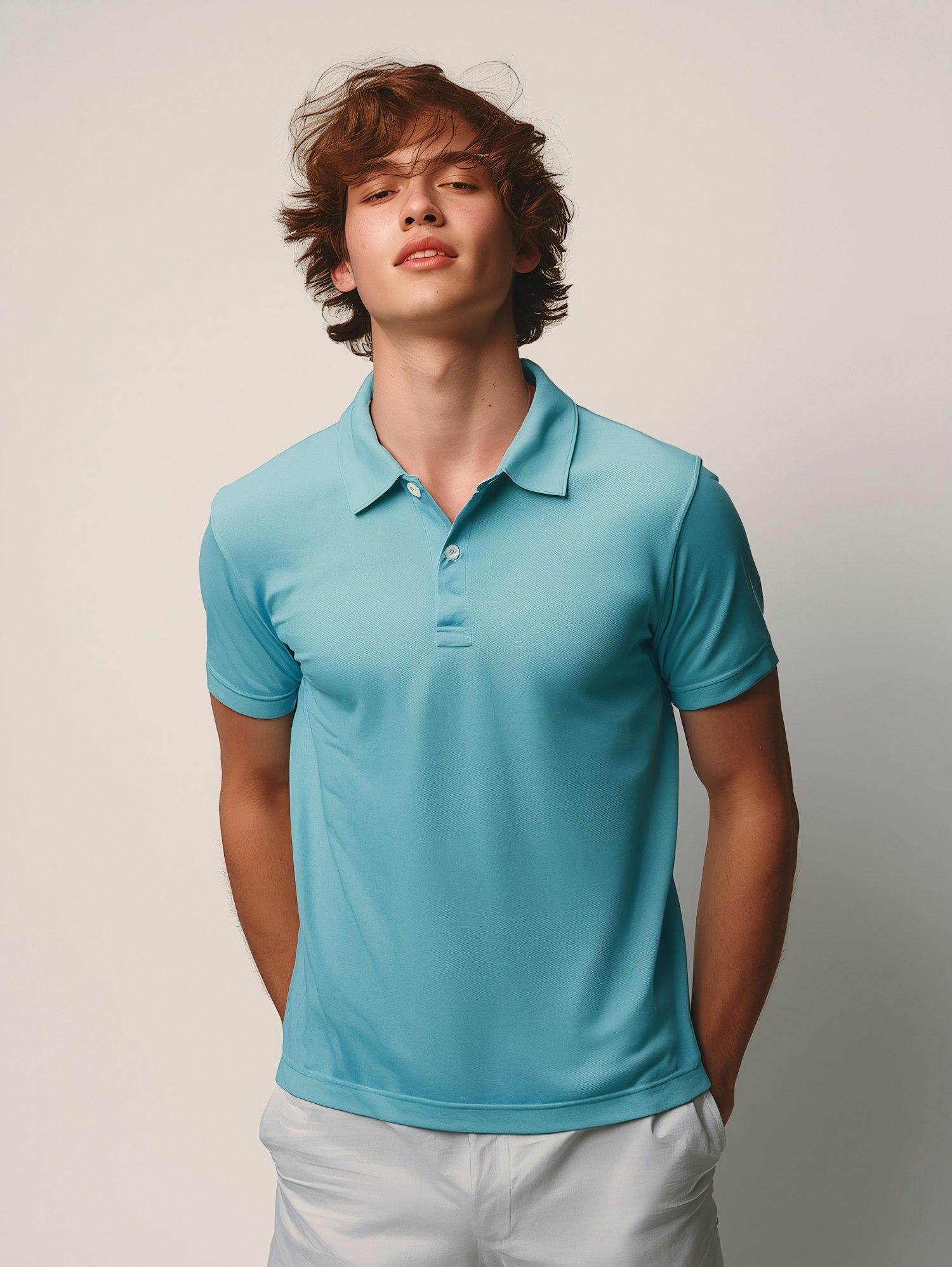 Young man in a light blue polo shirt and white shorts, posing casually against a neutral background.