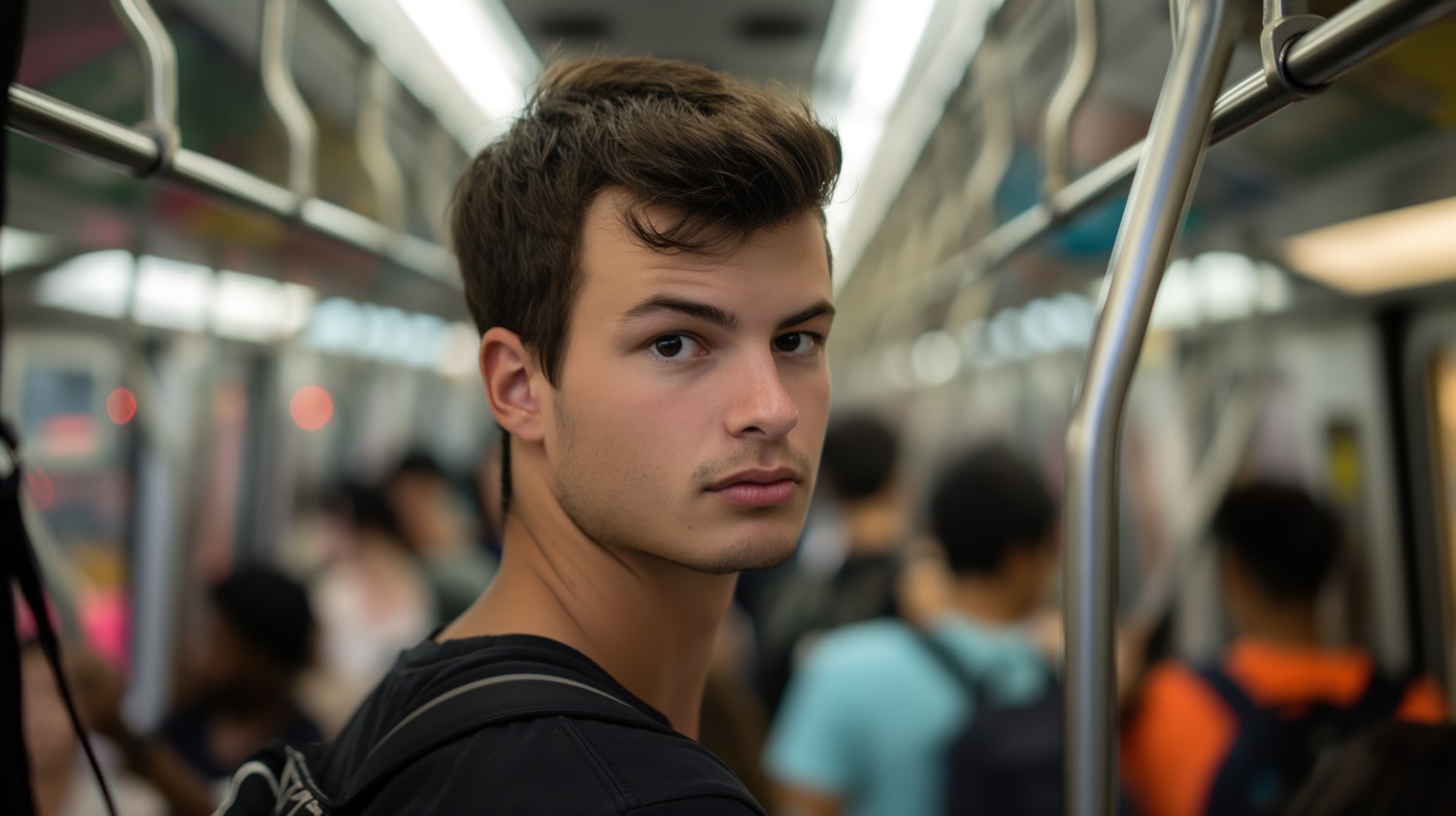 Young man with brown hair and backpack in a crowded subway, looking at the camera. Brightly lit interior with blurred background.