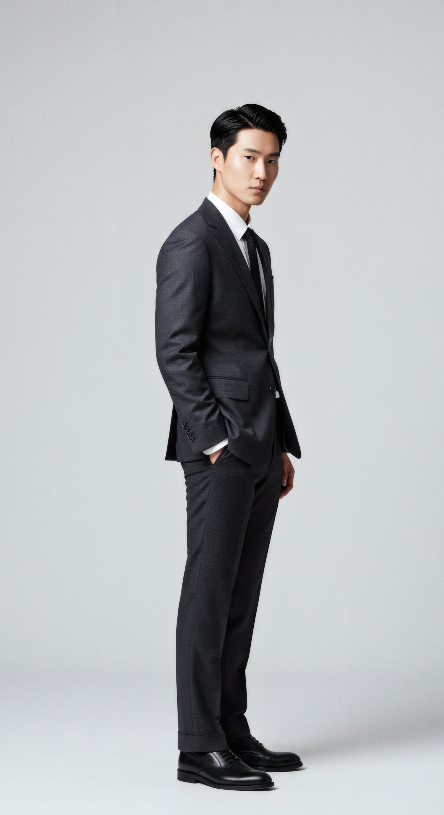 Young man in a sharp dark gray suit with a white shirt and black tie, standing confidently against a plain light gray background.