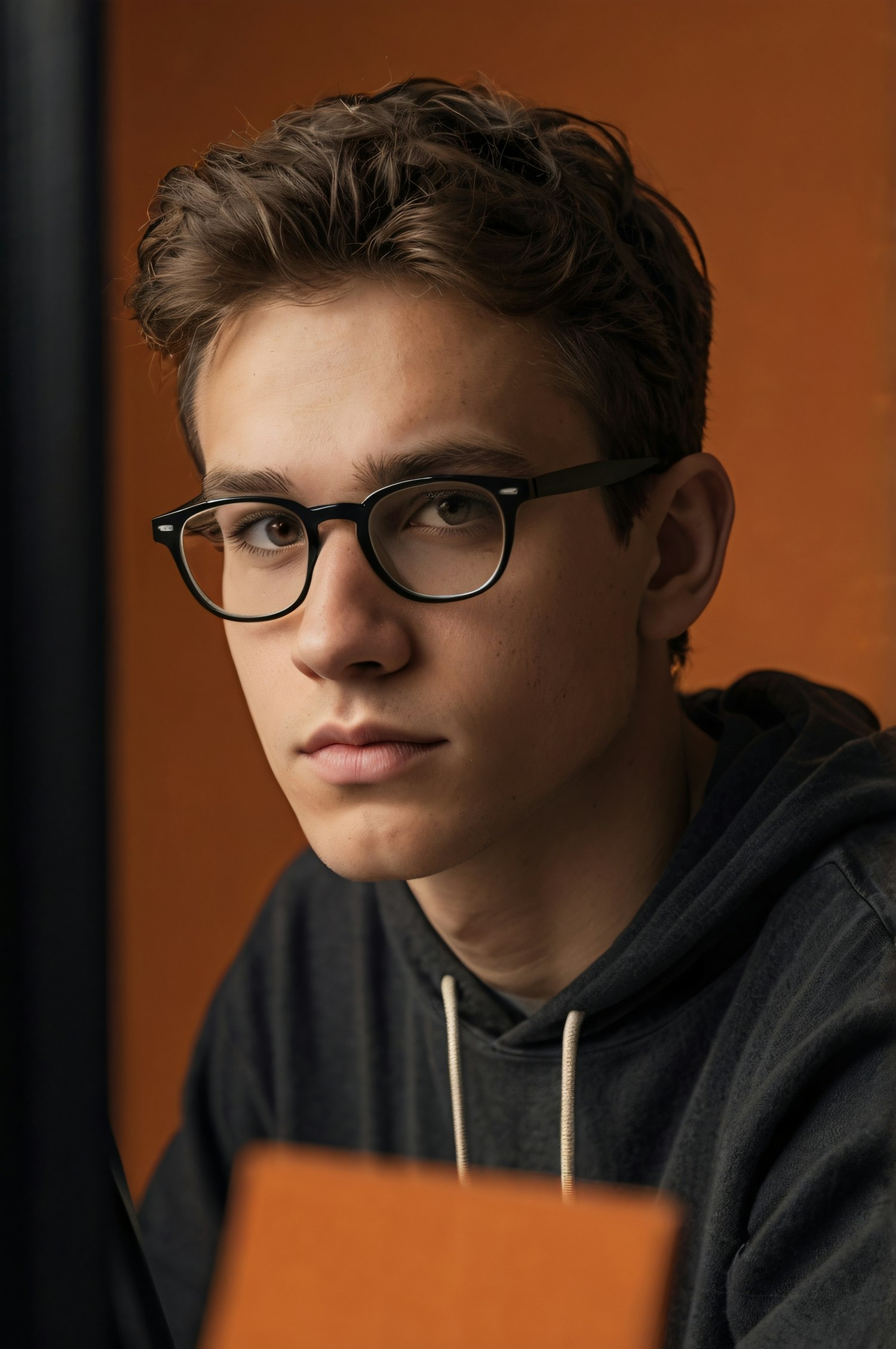 Young man with glasses and a hoodie, set against a warm orange background, exuding a thoughtful and introspective vibe.