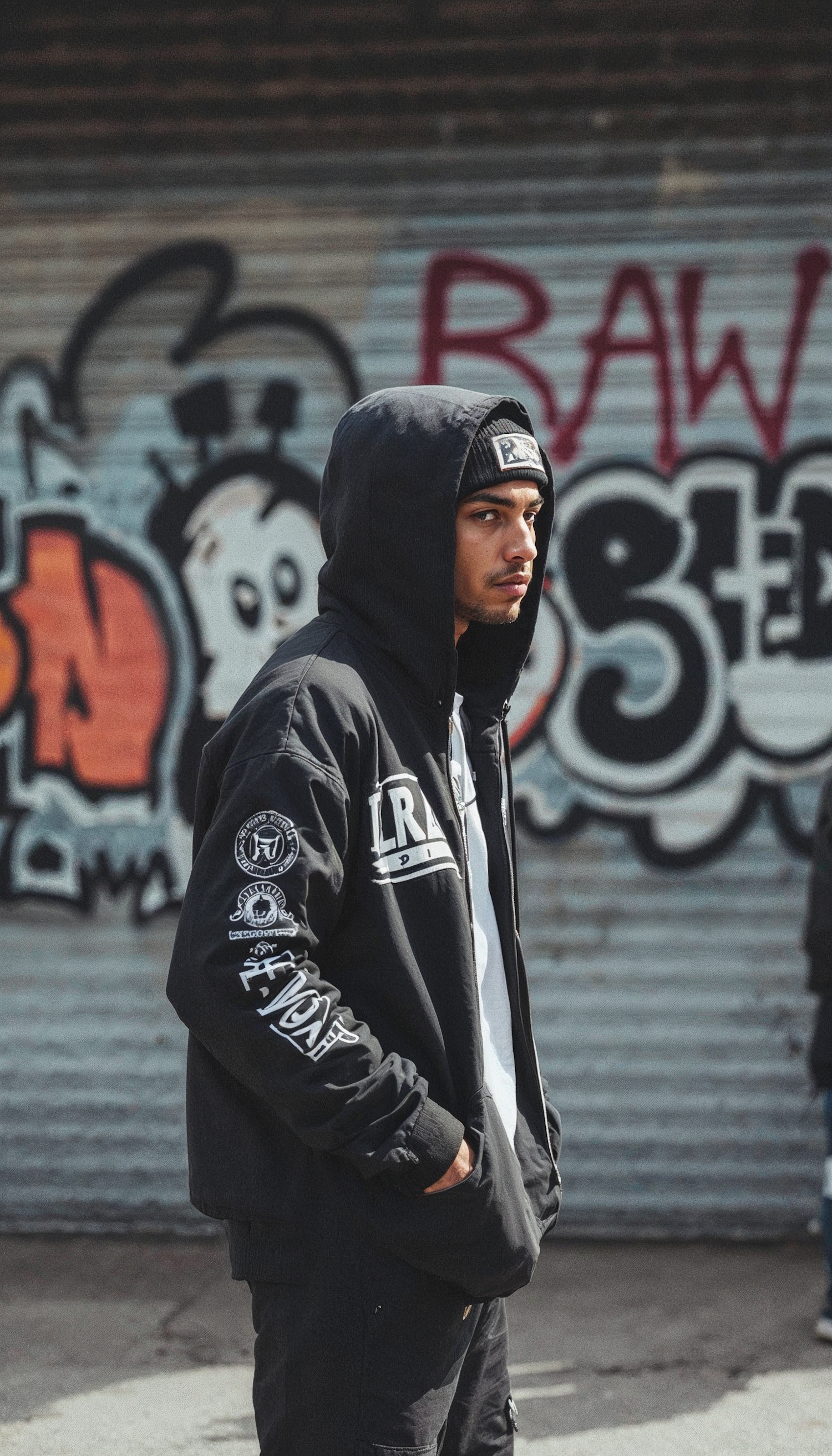 Urban streetwear style with a black hoodie and graffiti backdrop, featuring bold colors and artistic designs for an edgy vibe.