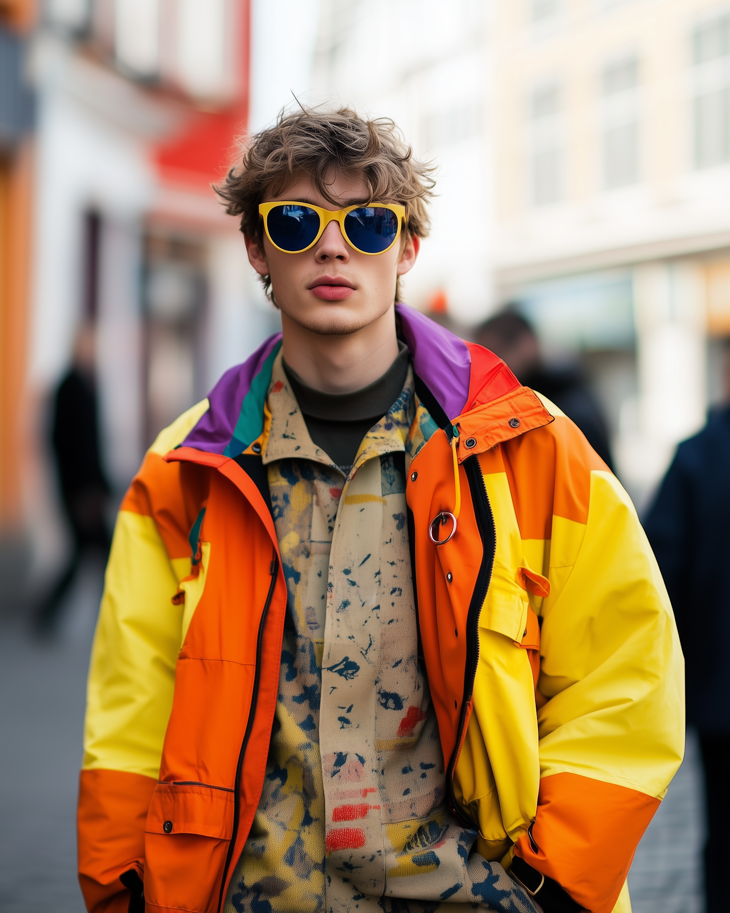 Stylish young man in bold yellow sunglasses and a vibrant orange-yellow jacket, standing in an urban street setting.