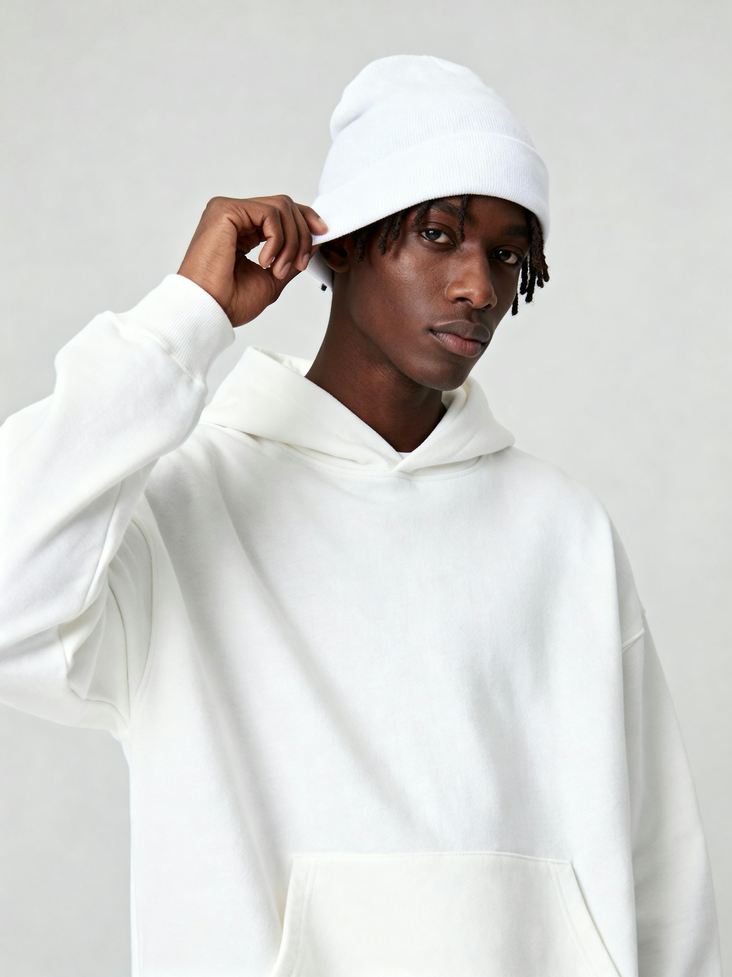 A stylish young man in a white hoodie and beanie poses confidently against a neutral background.