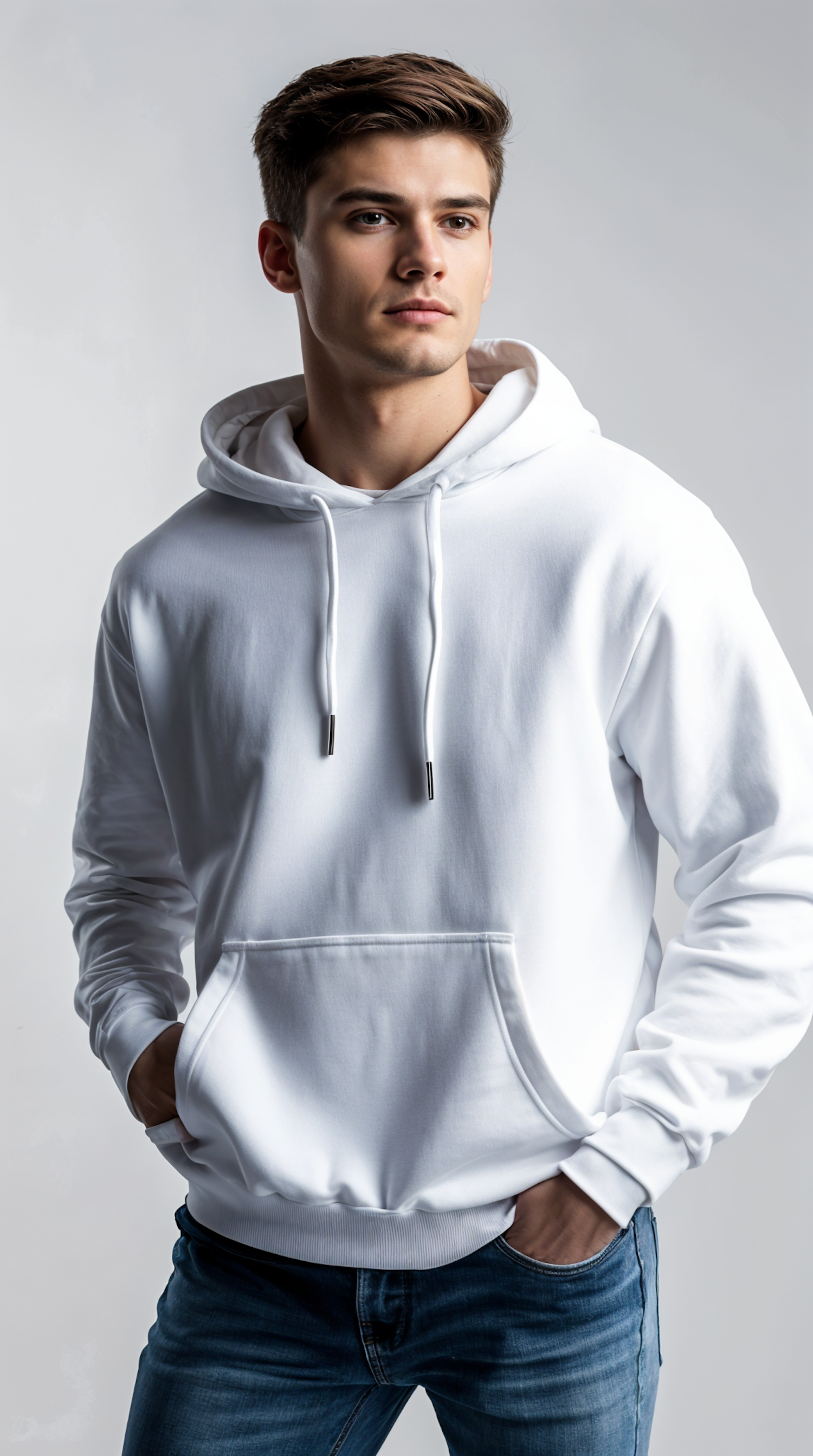 Young man in a white hoodie and blue jeans, posing against a light gray background with a calm expression.