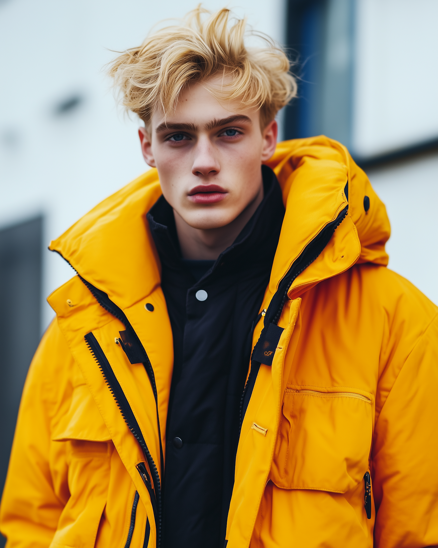 Young man with tousled blonde hair in a vibrant yellow puffer jacket, set against a blurred urban background.
