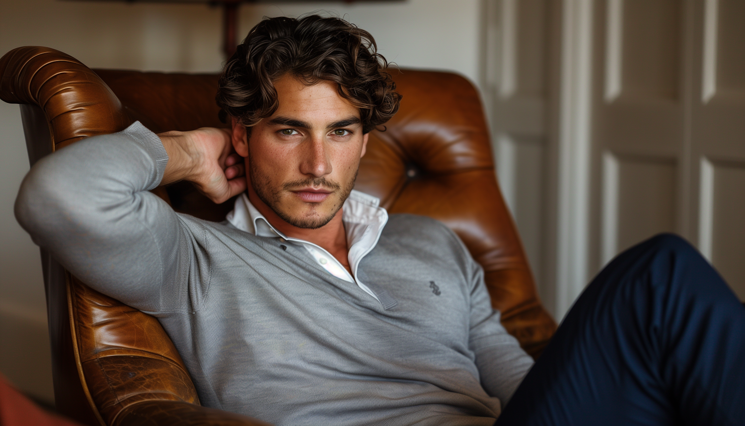 Caucasian man with curly hair and stubble beard in a gray sweater, seated in a brown leather chair, exuding confidence.
