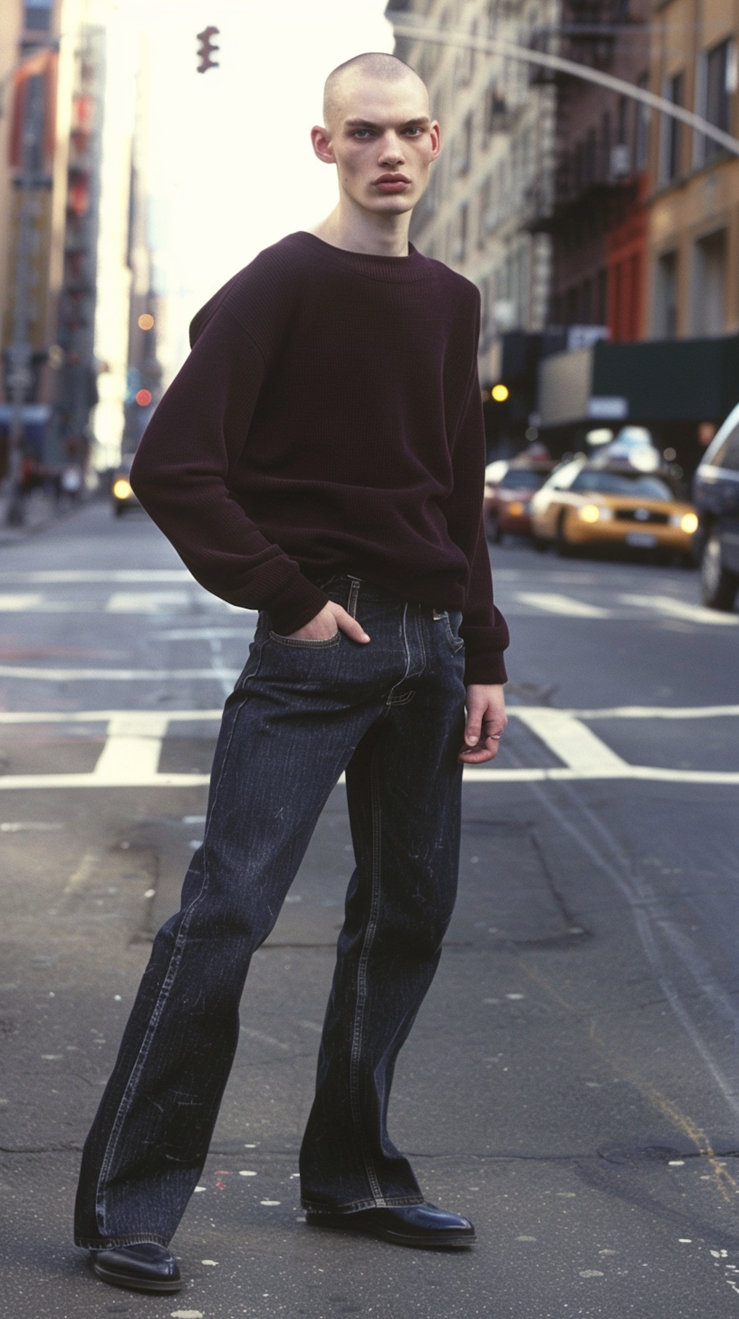 Young man with shaved head in dark sweater and flared jeans stands on city street, exuding urban style and confidence.