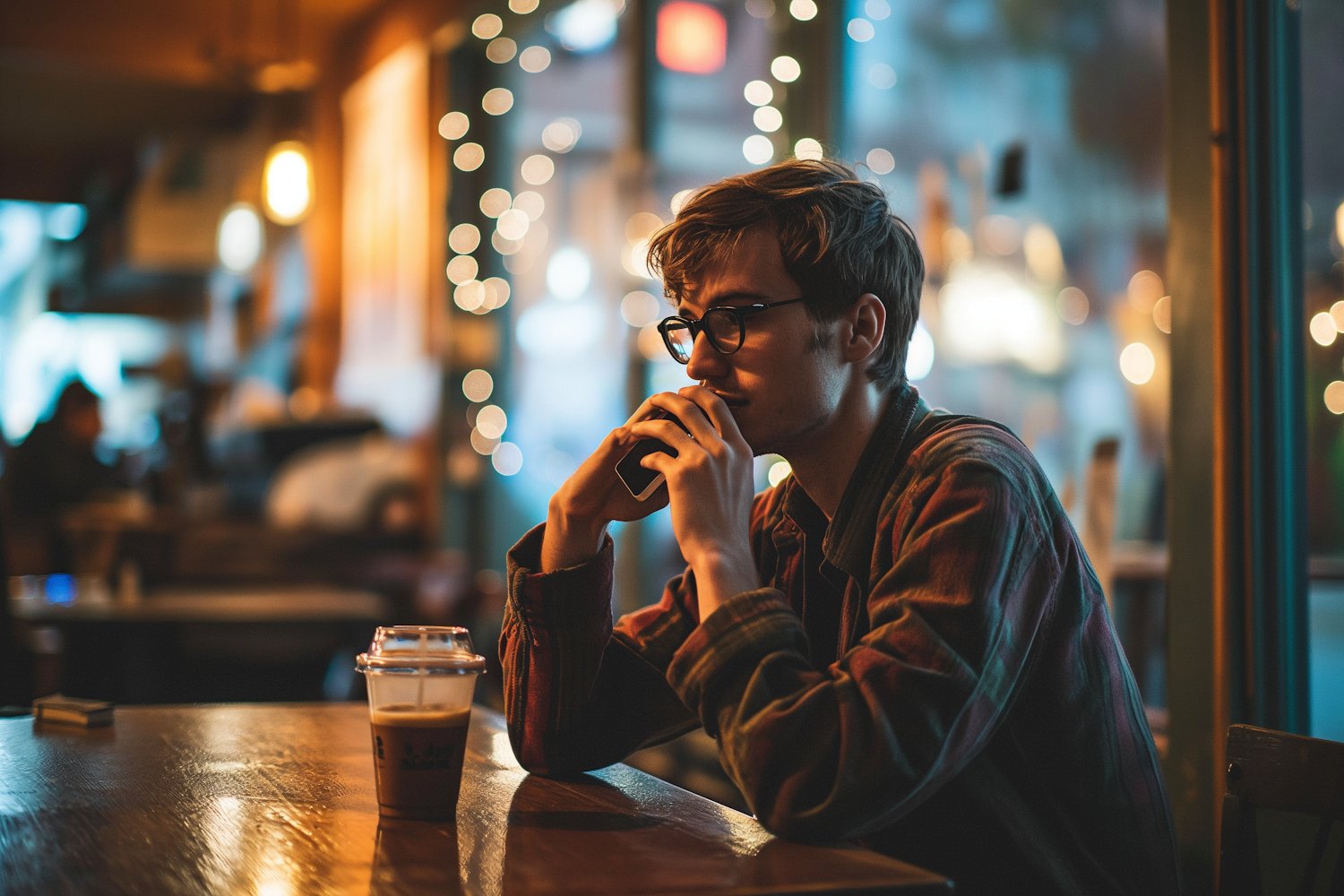 Young man in a cozy café, holding a smartphone, with warm lighting and festive bokeh lights in the background.