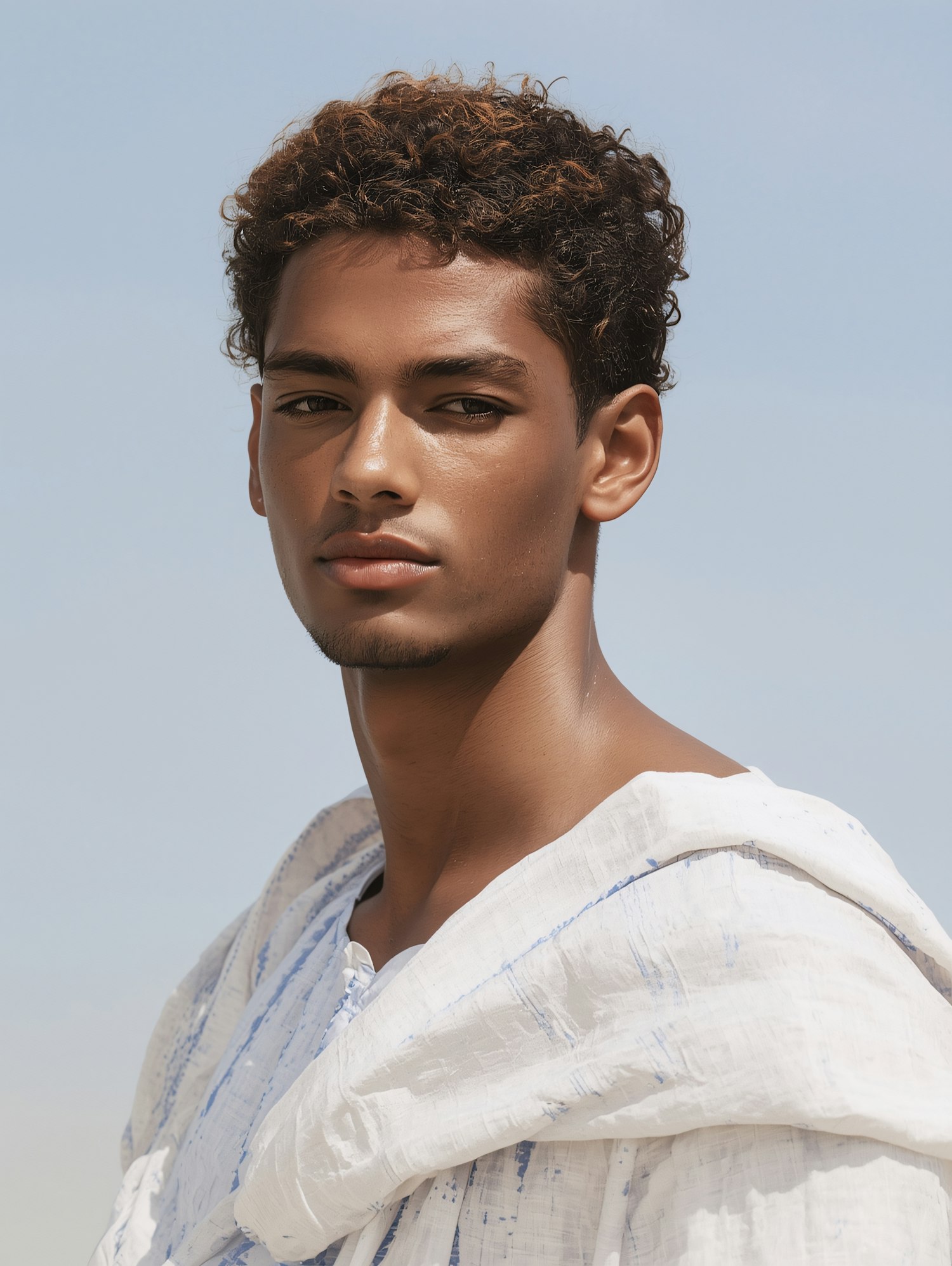 Portrait of a young man with curly hair and a white garment against a clear blue sky, showcasing natural lighting and serene vibes.