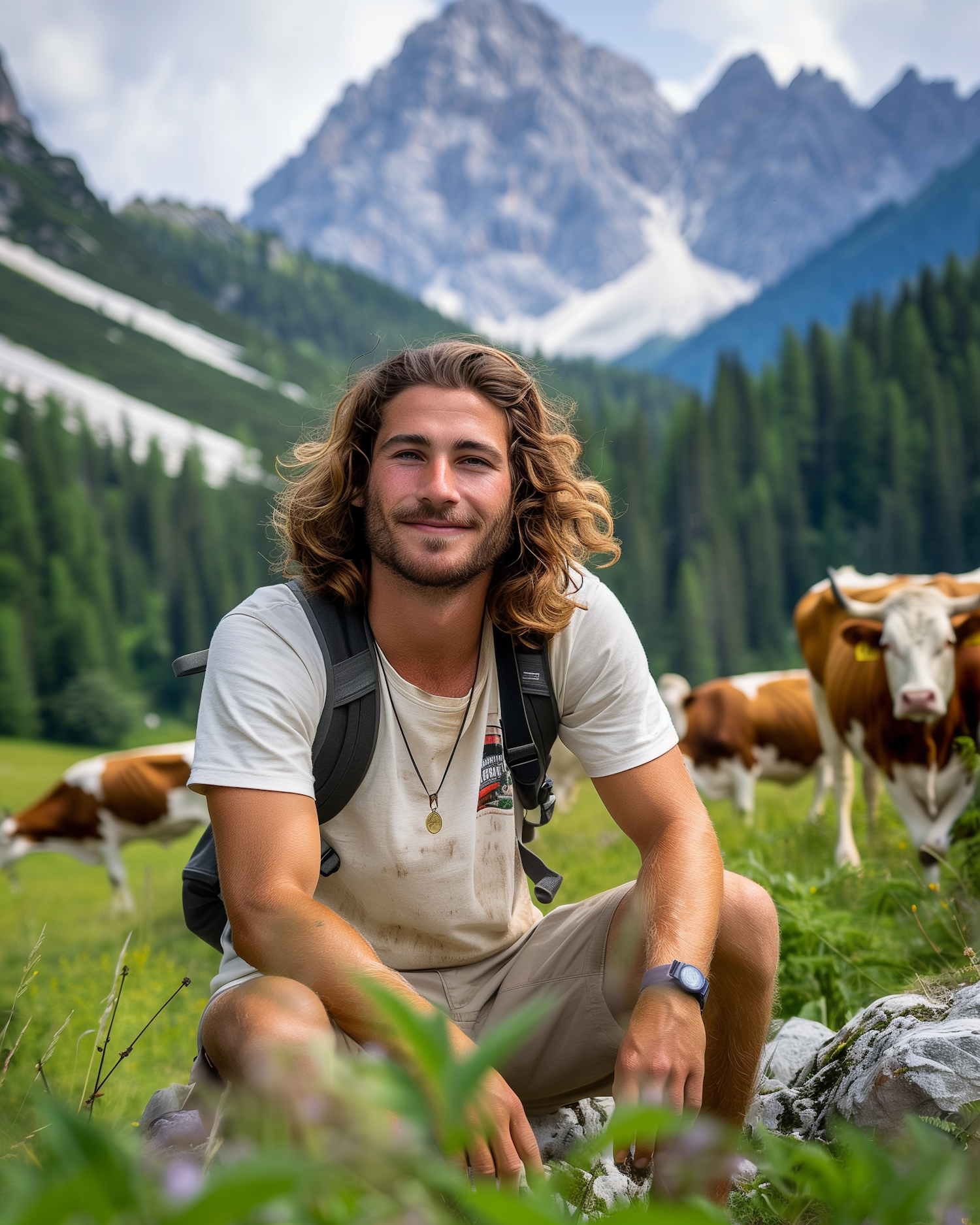 Young man with long hair hiking in a meadow with cows and mountains in the background, enjoying a serene outdoor moment.