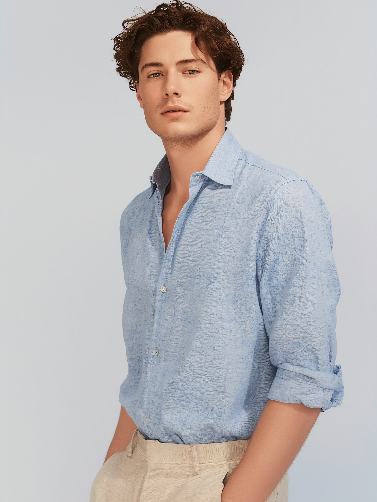 Stylish young man in a light blue shirt and beige trousers, posing against a neutral background with a confident and relaxed demeanor.