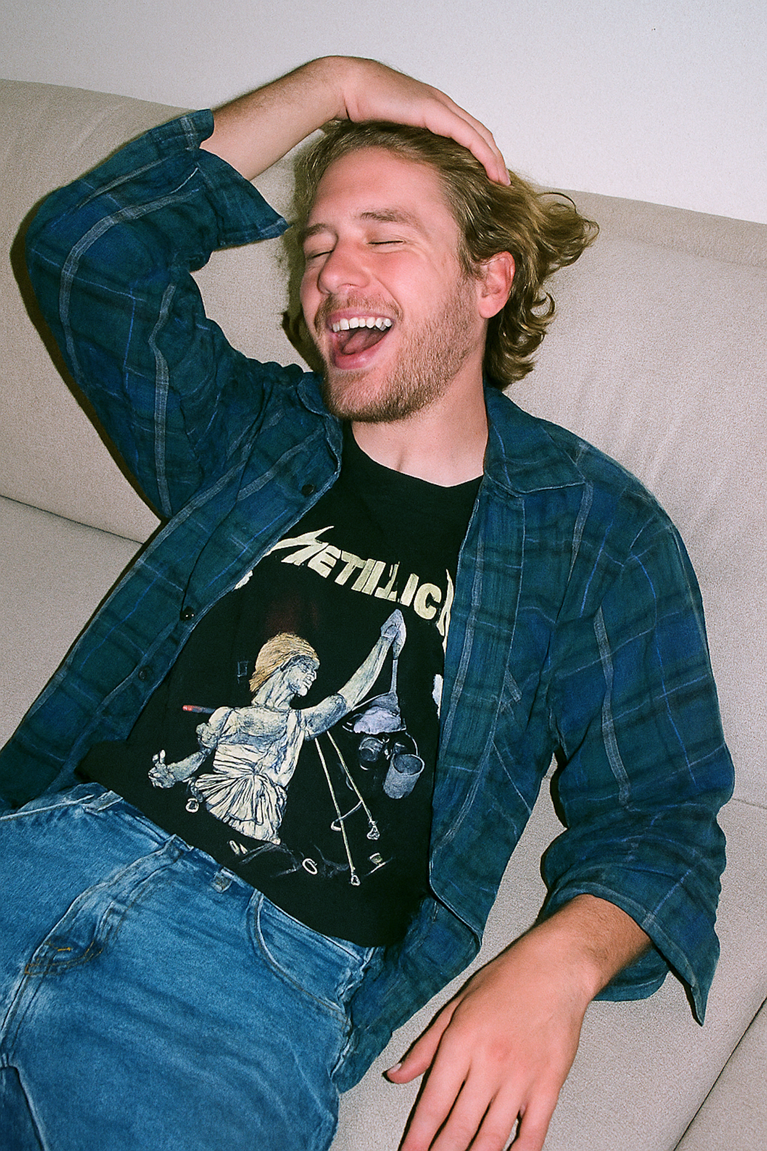 A cheerful man in a Metallica T-shirt and plaid shirt laughs on a beige couch, exuding a relaxed and carefree vibe.