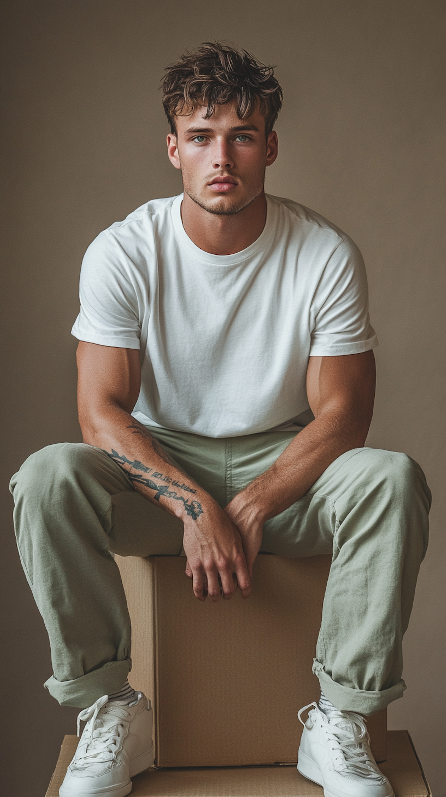 Young man with tousled hair and tattoos sits on a box, wearing a white t-shirt and green pants, exuding a casual and relaxed vibe.