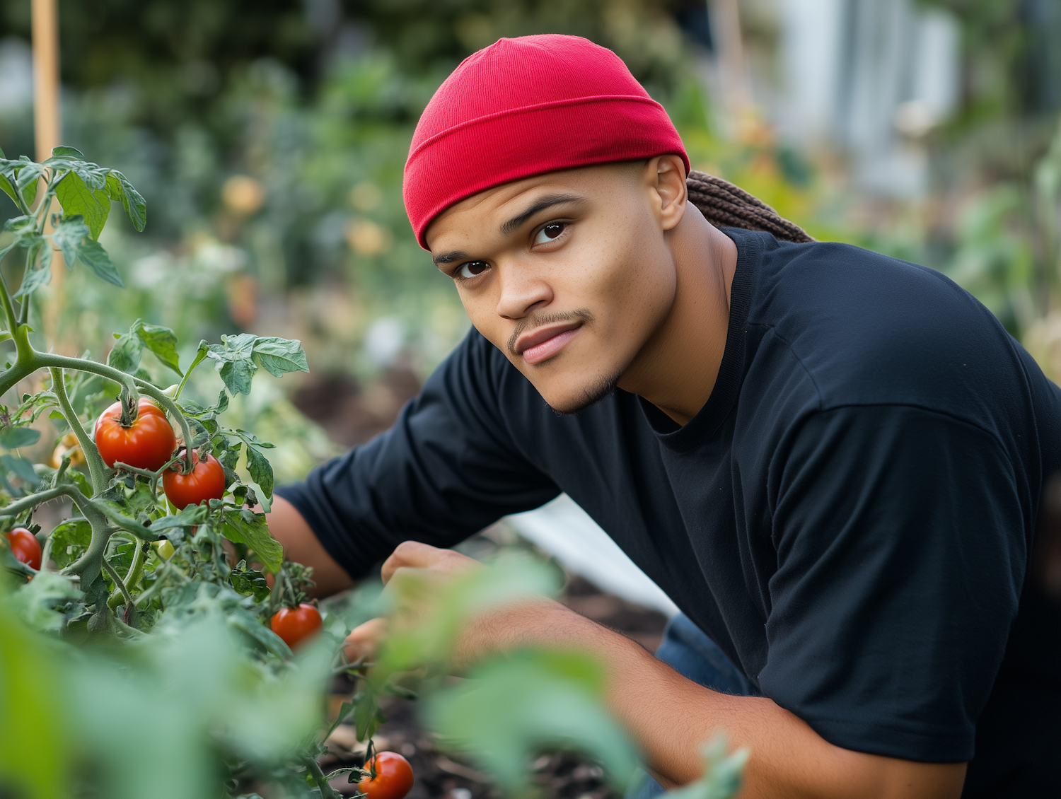 Young man in a garden tending to ripe tomatoes, wearing a red headscarf and black t-shirt, surrounded by lush greenery.