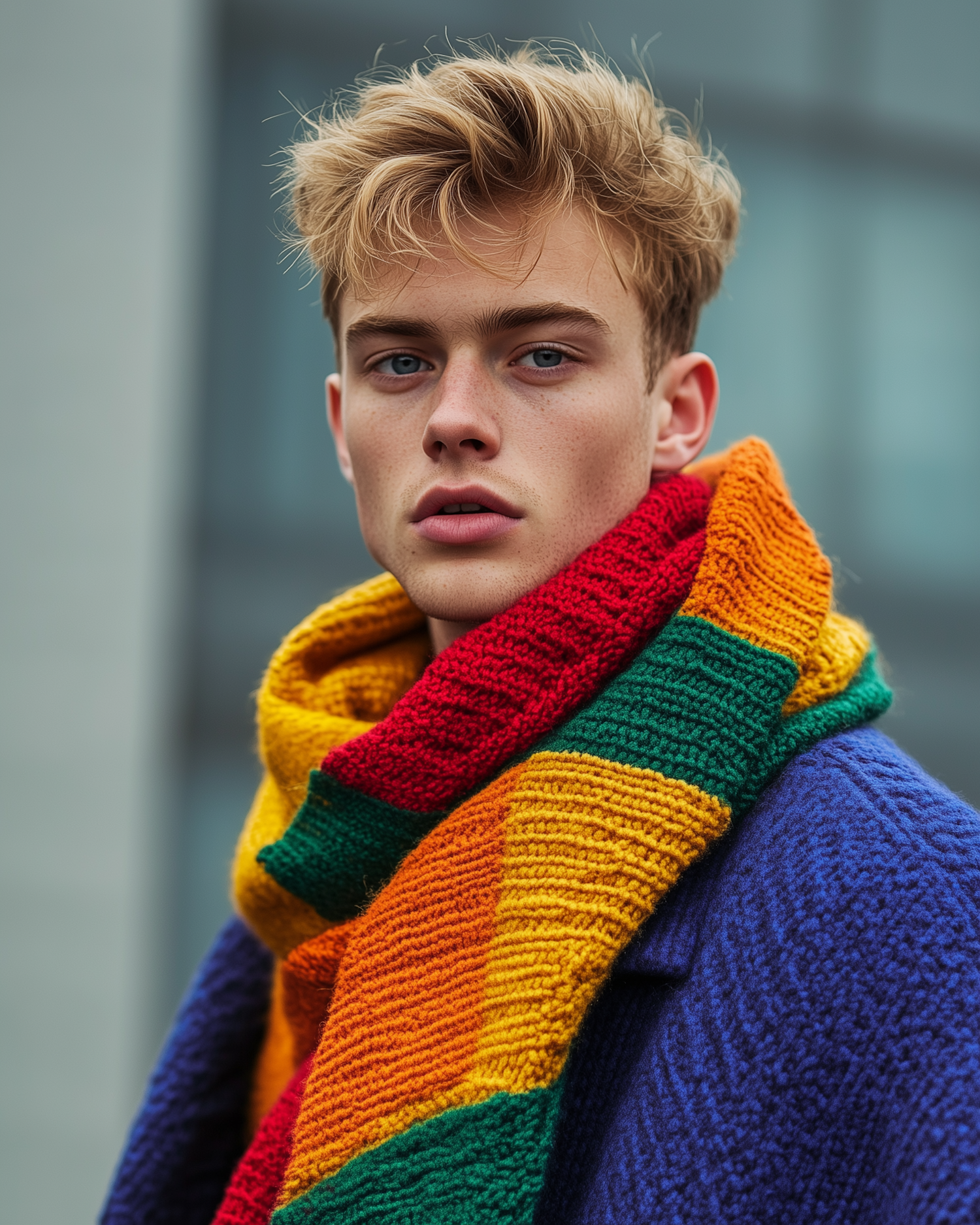 Young man with tousled blonde hair, wearing a colorful scarf and blue coat, gazes intently. Urban background adds depth.