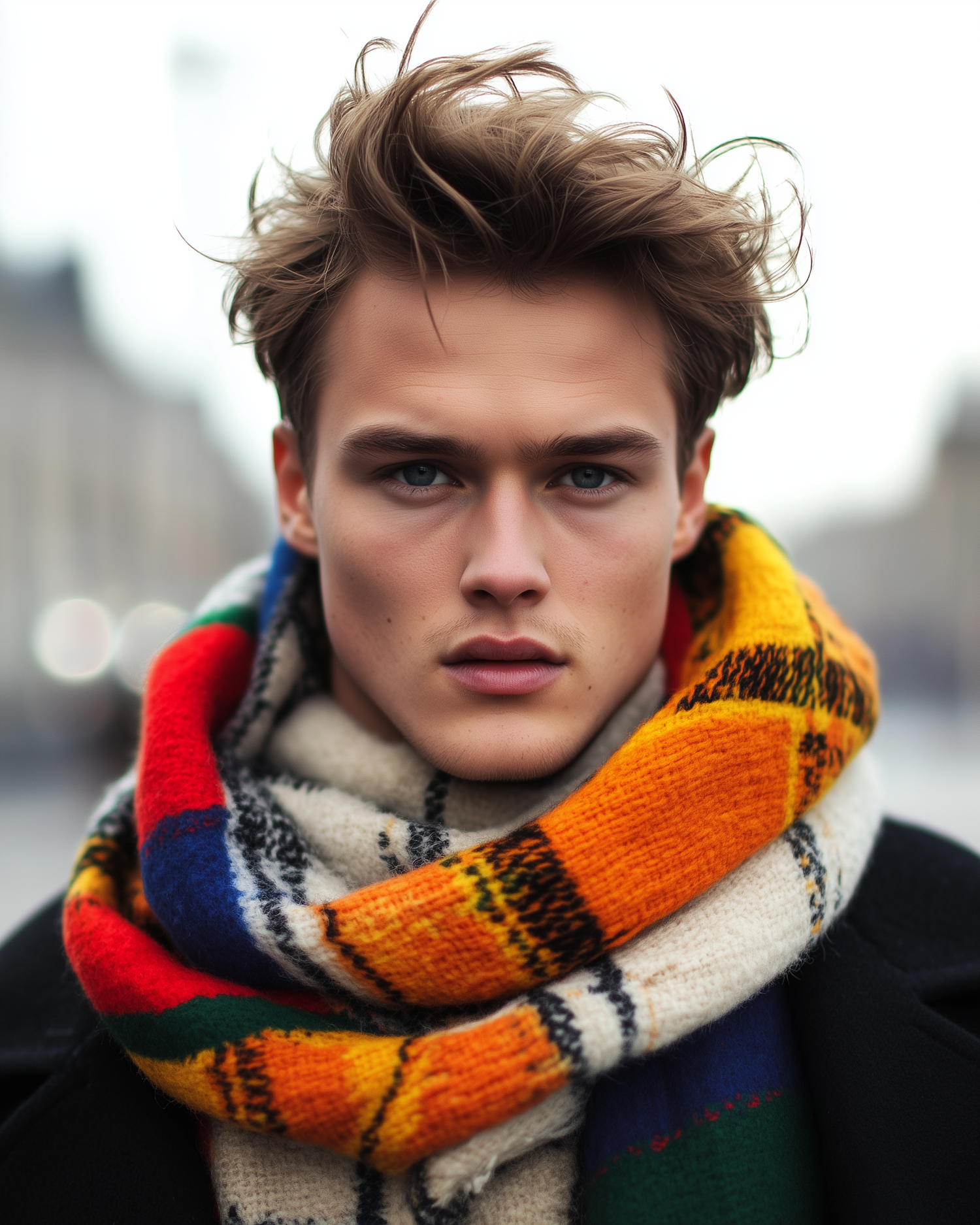 Young man with tousled hair and colorful scarf, gazing intently. Vibrant colors contrast with muted city background.