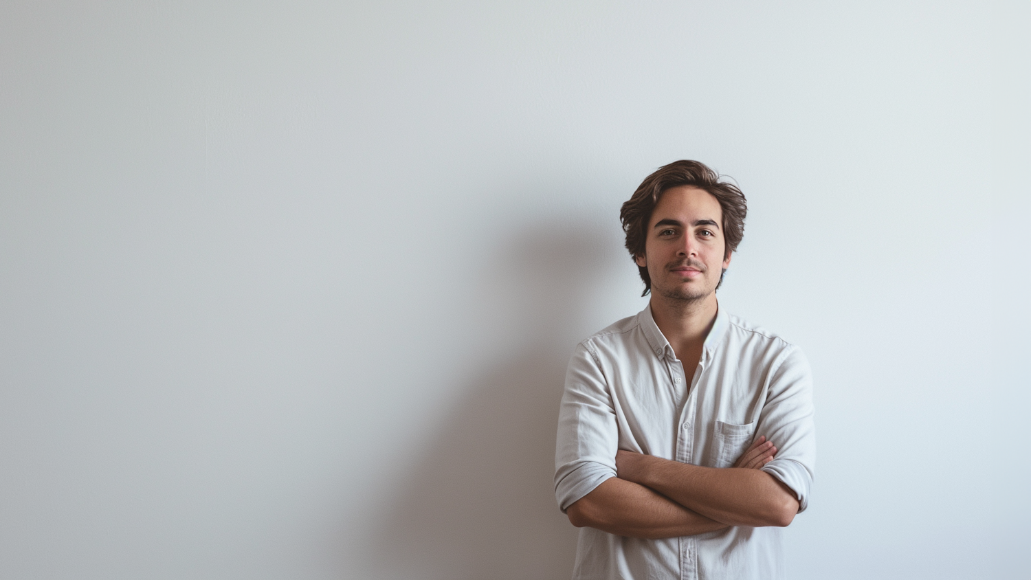 Young man with dark hair and light shirt stands confidently against a plain white background, arms crossed and smiling slightly.