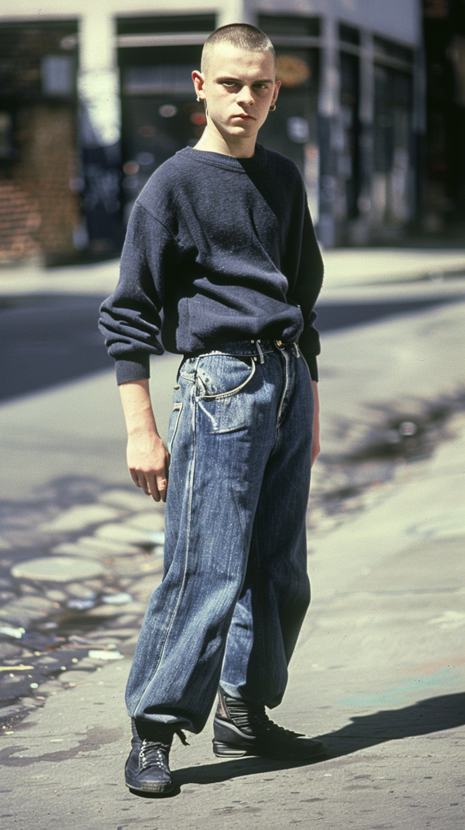 Young man with shaved head in dark sweater and loose jeans, standing confidently on a city street.