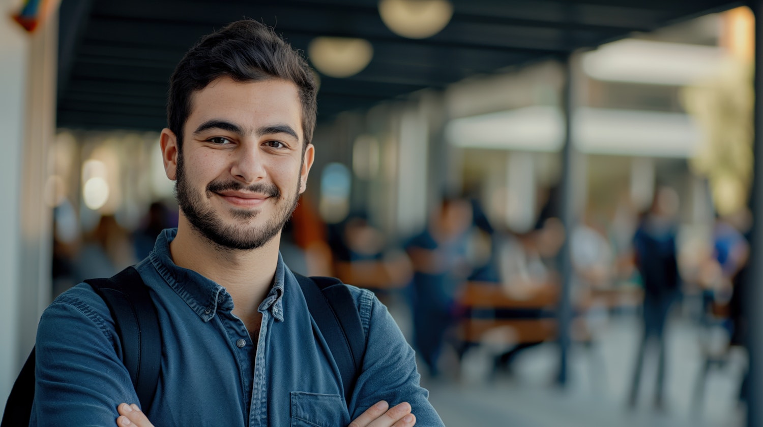 Young man with dark hair and beard, smiling in a casual blue shirt, standing outdoors with a blurred background of people.