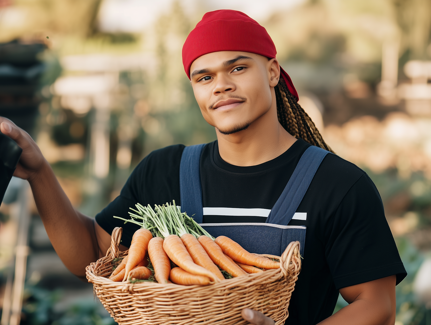 Young man in overalls holding a basket of fresh carrots in a garden, wearing a red bandana and smiling contently.