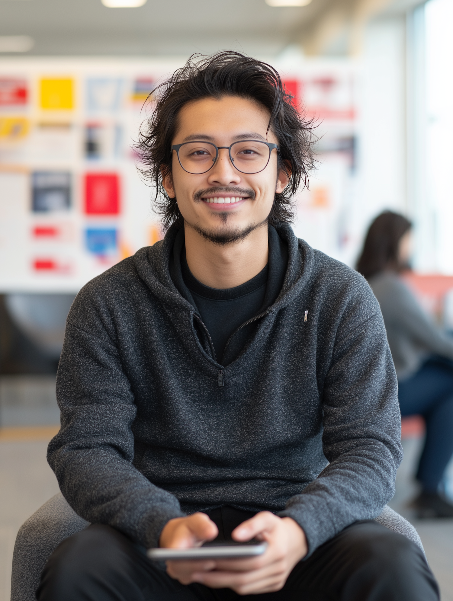 Smiling Asian man with glasses and beard holding a tablet in a modern, colorful workspace.